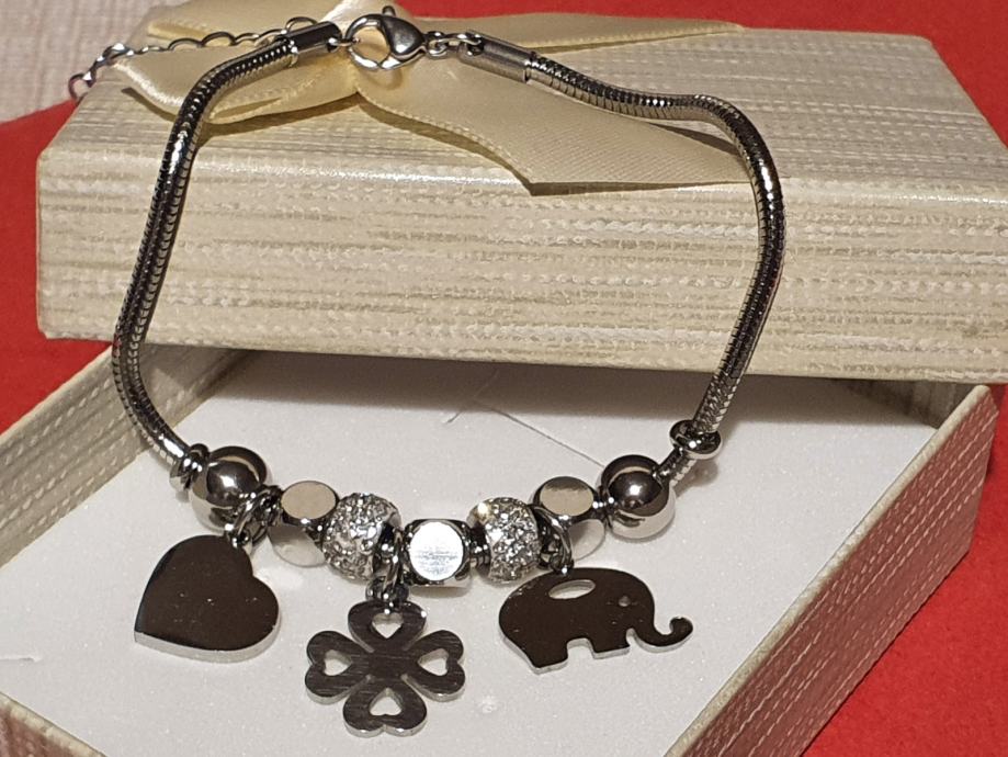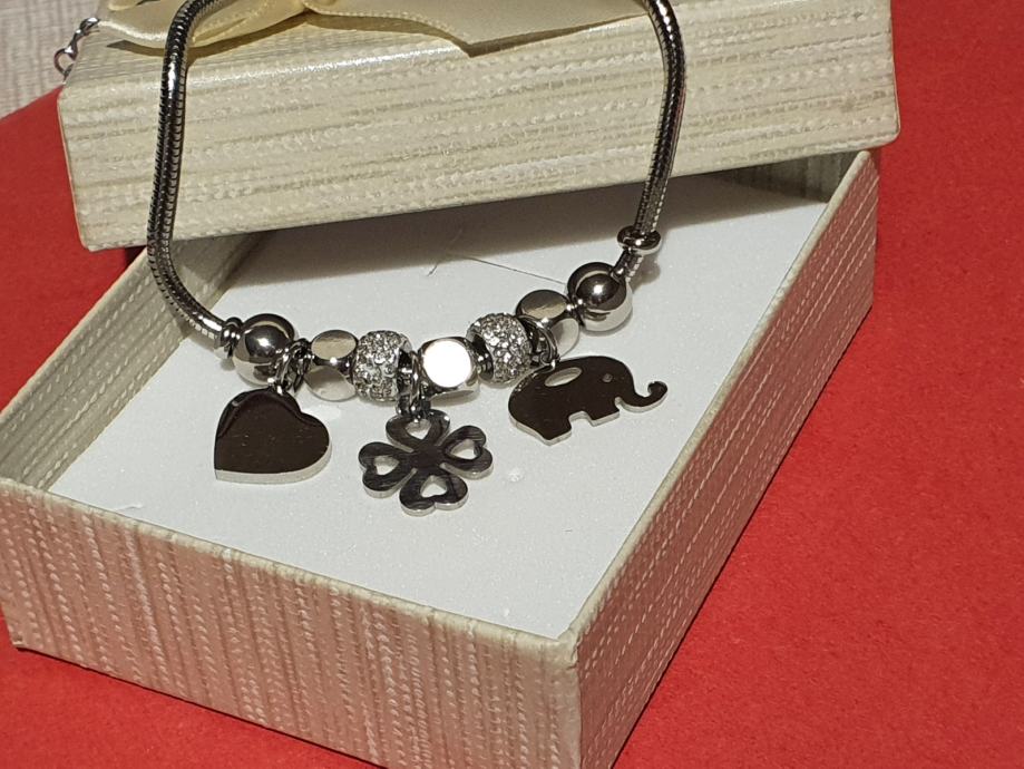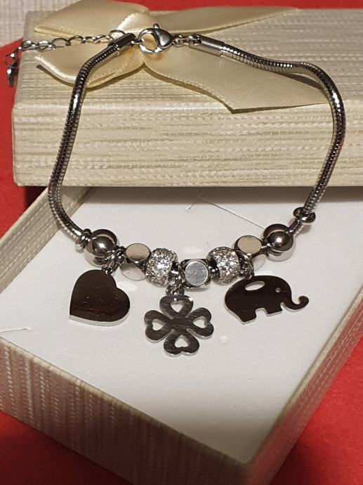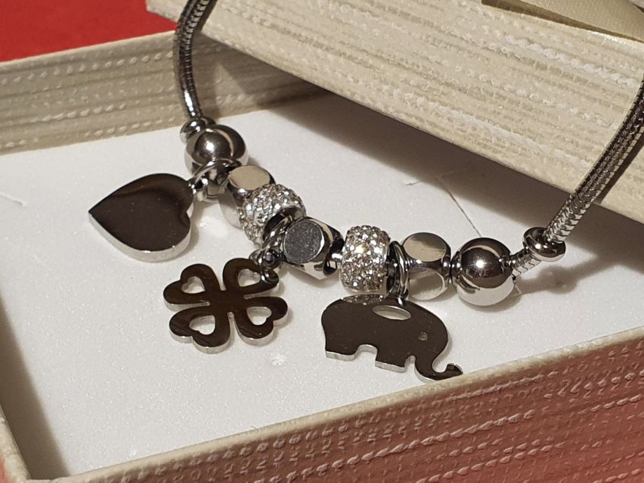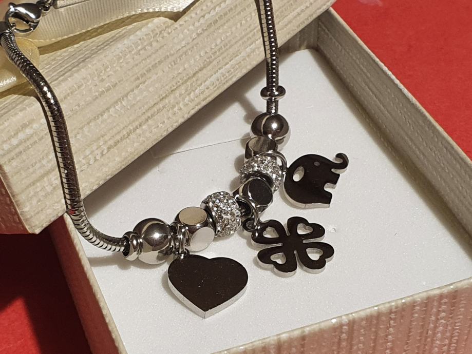 Narukvica je personalizirana što znači da birate privjeske na njoj (slovo, djetelina, srce, zvijezda, djevojčica, drvo života, anđeo, čudotvorna medaljica Majka Božja, križić, anđeosko krilo, sidro, zvijezda, sv.Benedikt, jednorog, slonić, sova, šapa, obitelj, djevojčica i dječak, itd.)