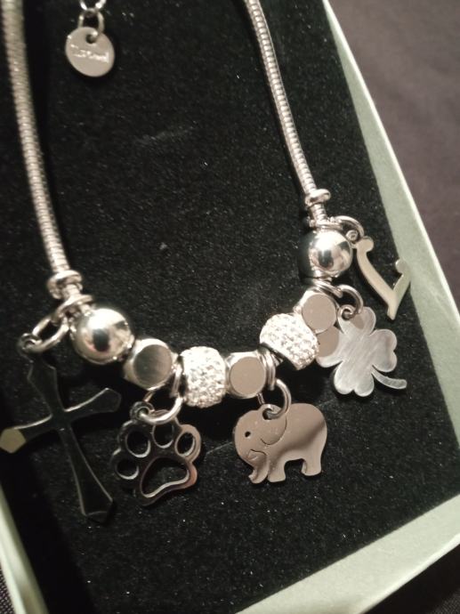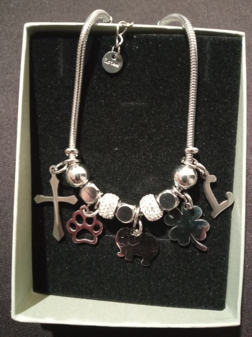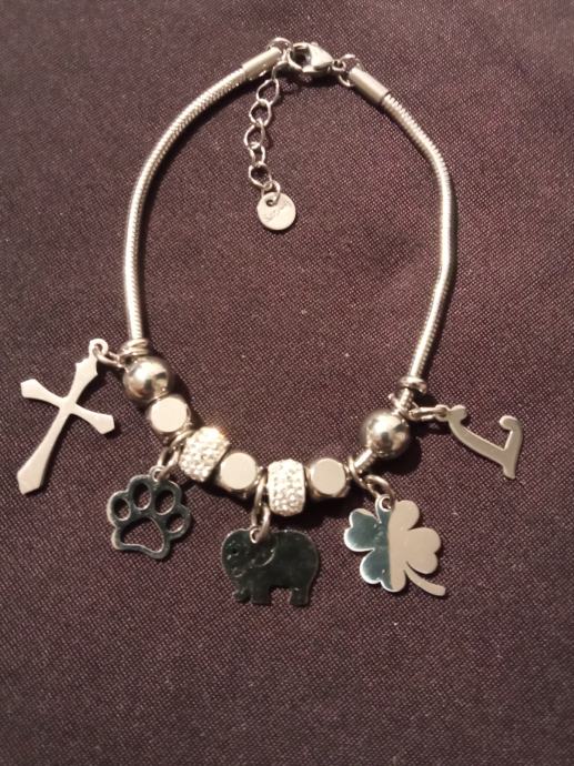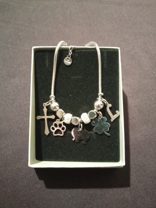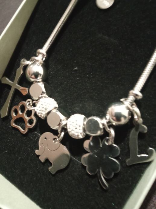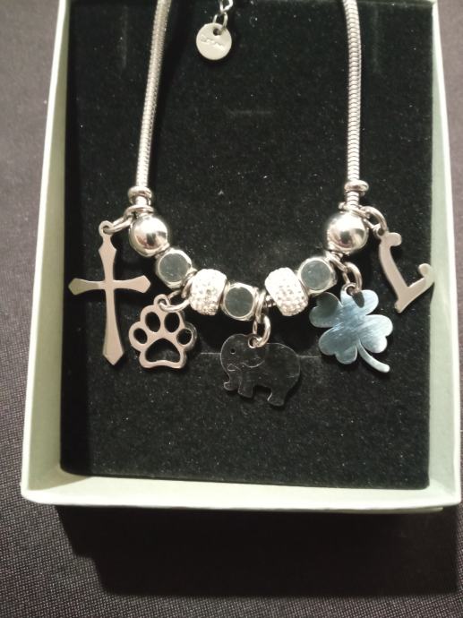 Narukvica je personalizirana što znači da birate privjeske na njoj (slovo, djetelina, srce, zvijezda, djevojčica, drvo života, anđeo, čudotvorna medaljica Majka Božja, križić, anđeosko krilo, sidro, zvijezda, sv.Benedikt, jednorog, slonić, sova, šapa, obitelj, djevojčica i dječak, itd.)