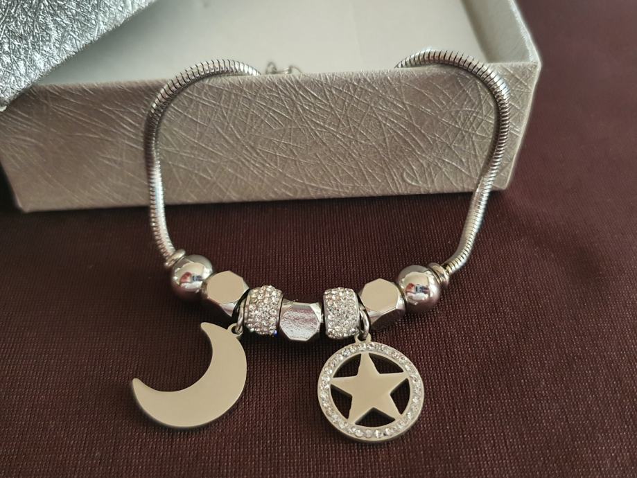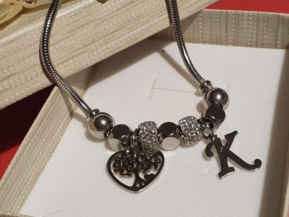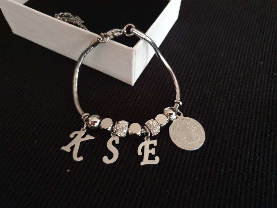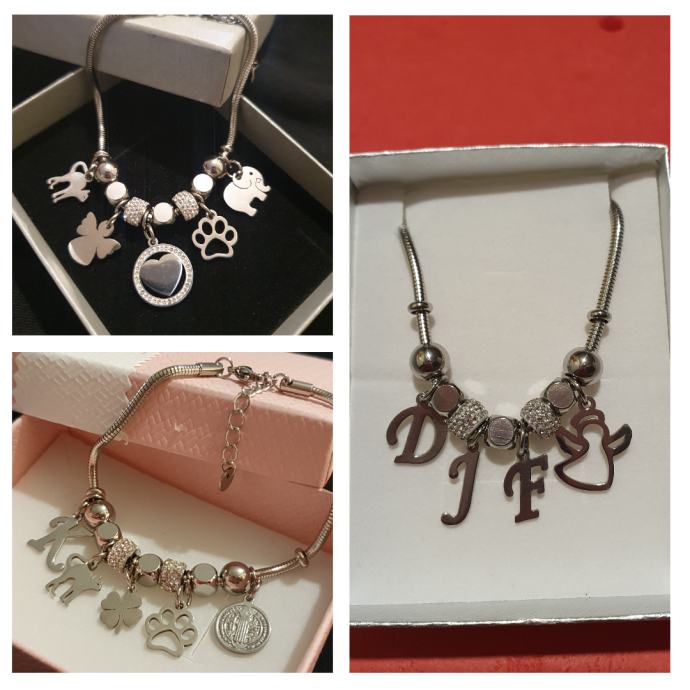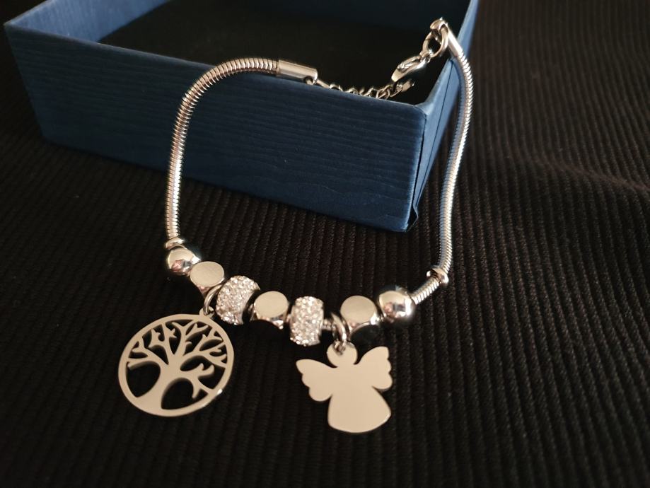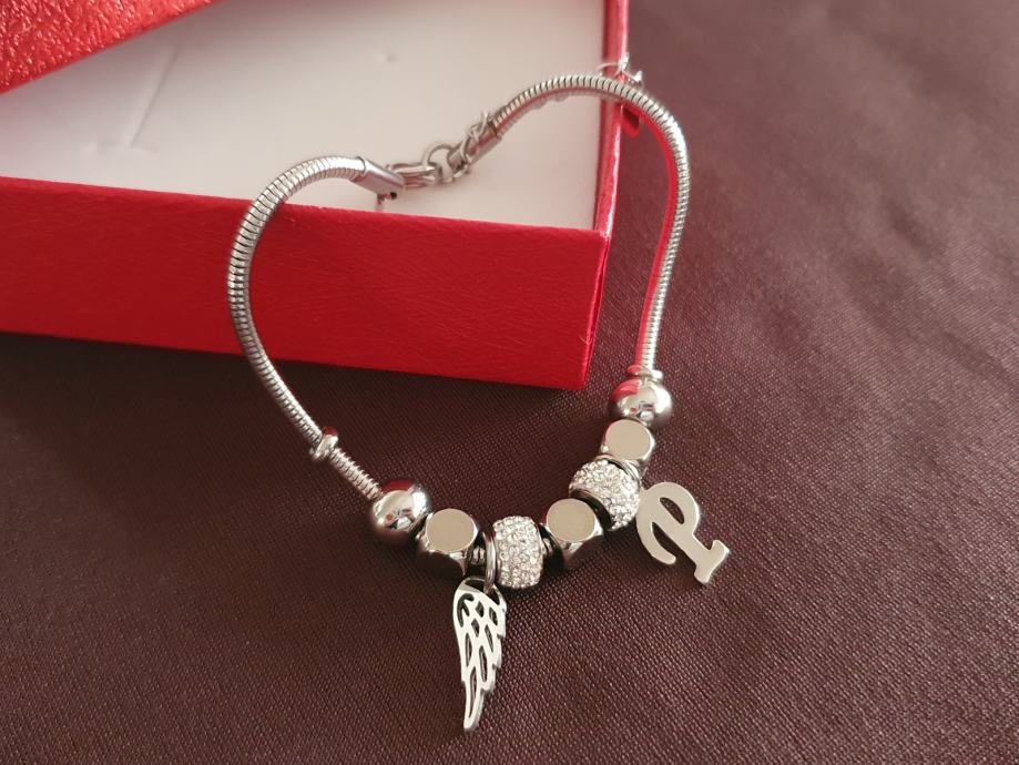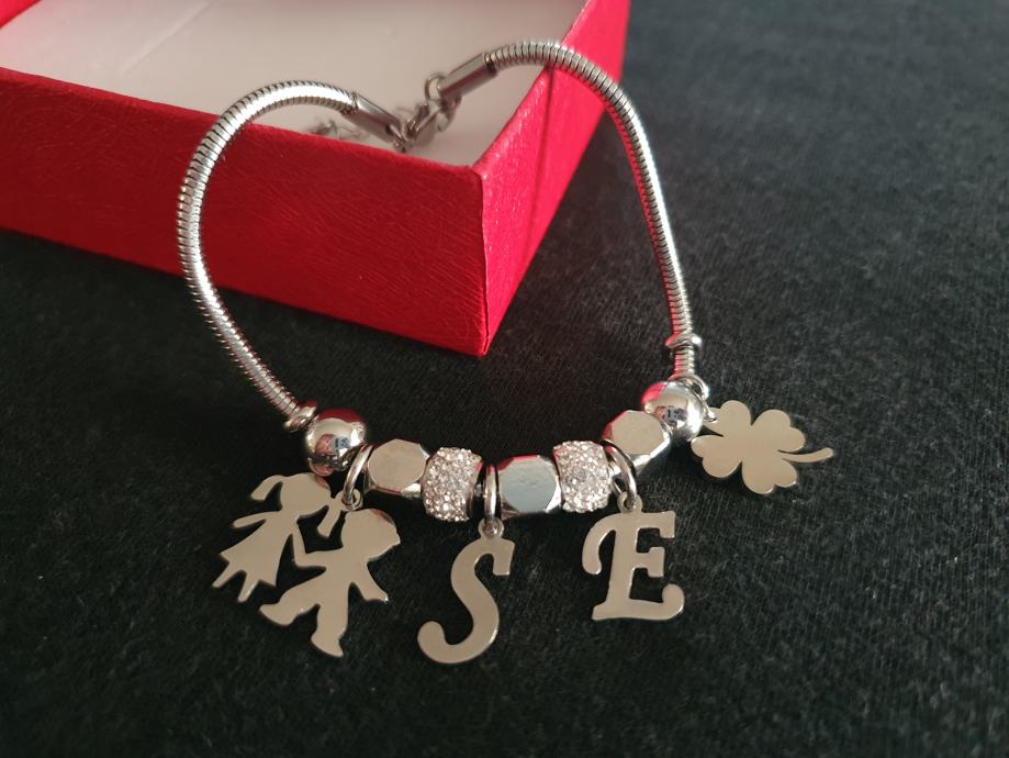 Narukvica je personalizirana što znači da birate privjeske na njoj (slovo, djetelina, srce, zvijezda, djevojčica, drvo života, anđeo, čudotvorna medaljica Majka Božja, križić, anđeosko krilo, sidro, zvijezda, sv.Benedikt, jednorog, slonić, sova, šapa, obitelj, djevojčica i dječak, itd.)