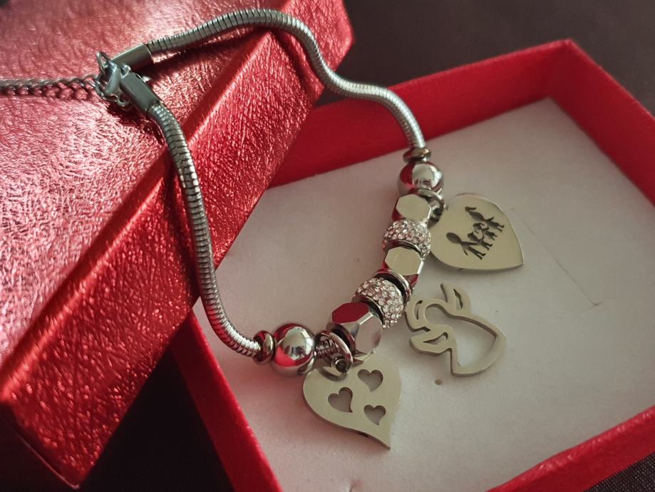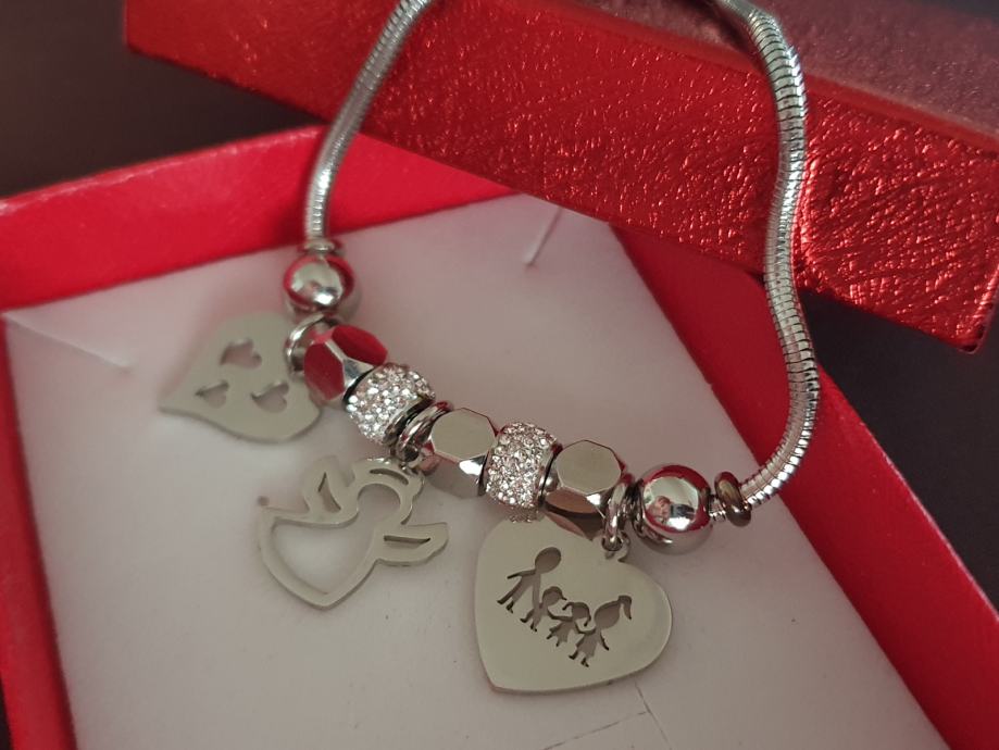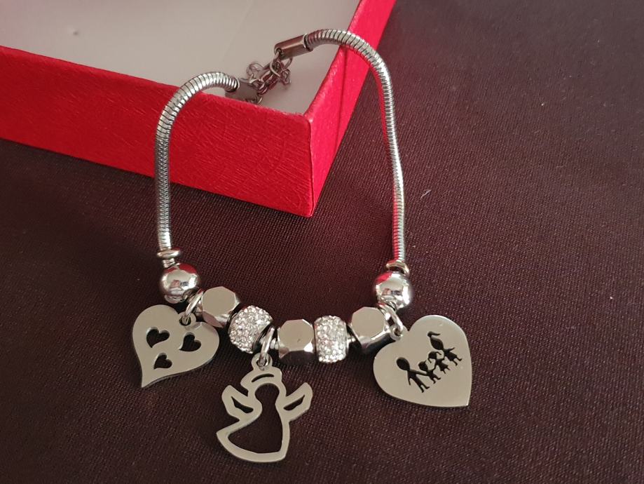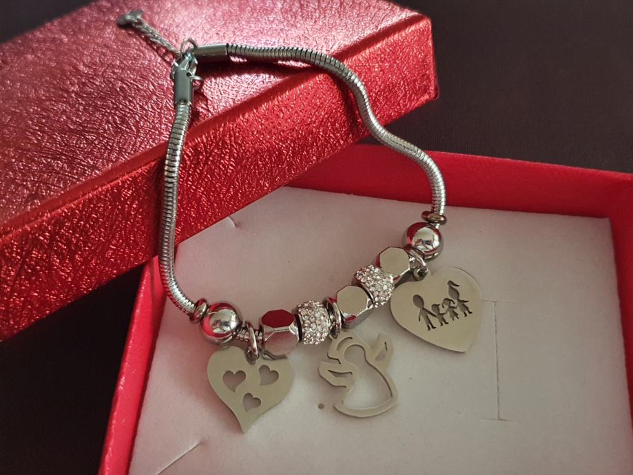 Narukvica je personalizirana što znači da birate privjeske na njoj (slovo, djetelina, srce, zvijezda, djevojčica, drvo života, anđeo, čudotvorna medaljica Majka Božja, križić, anđeosko krilo, sidro, zvijezda, sv.Benedikt, jednorog, slonić, sova, šapa, obitelj, djevojčica i dječak, itd.)