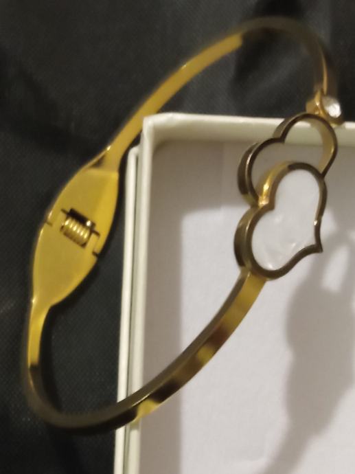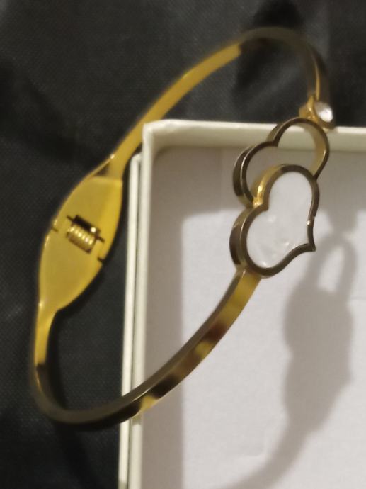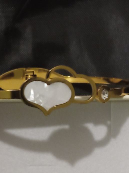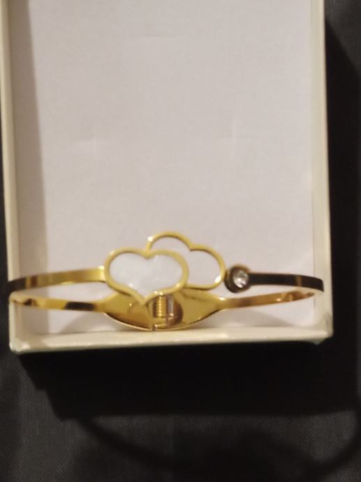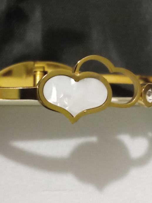 Narukvica medicinski čelik pozlaćena, čvrsta, unutarnji promjer 6 cm sa dva srca. Podloga jednog srca je sedef školjka. Kvalitetna i vrlo dojmljivog izgleda.