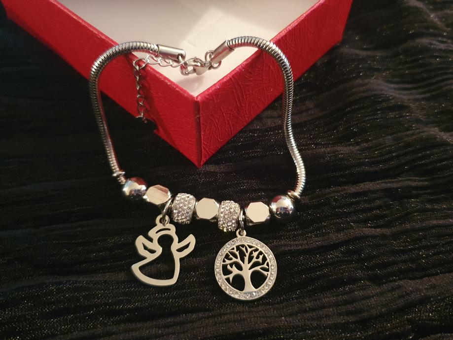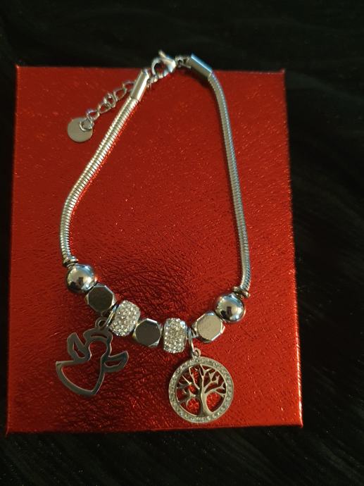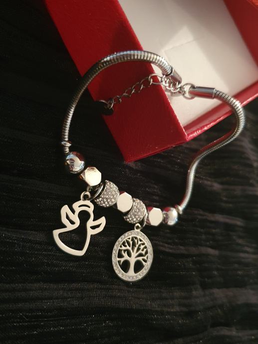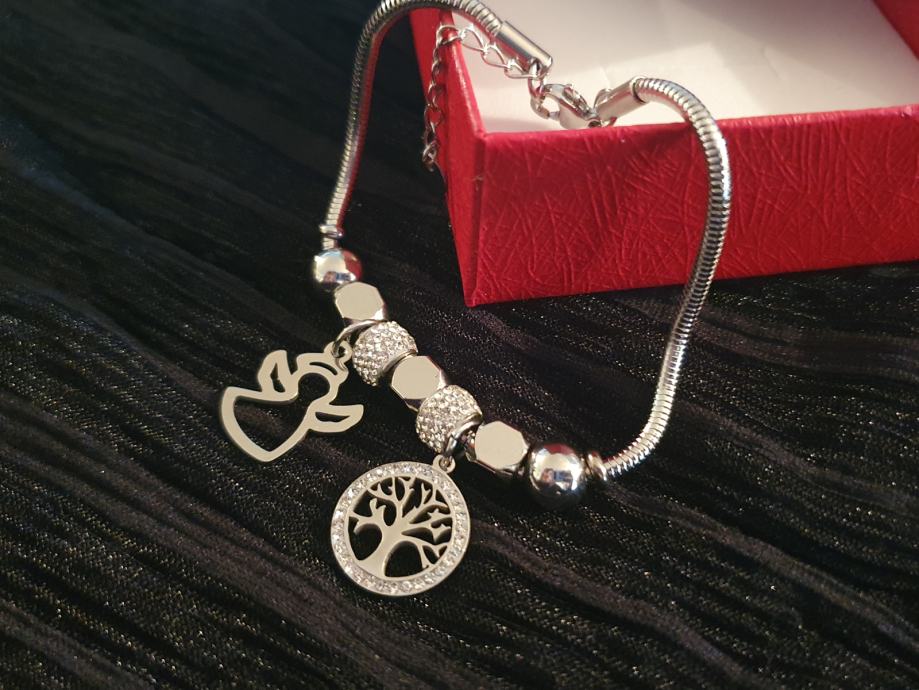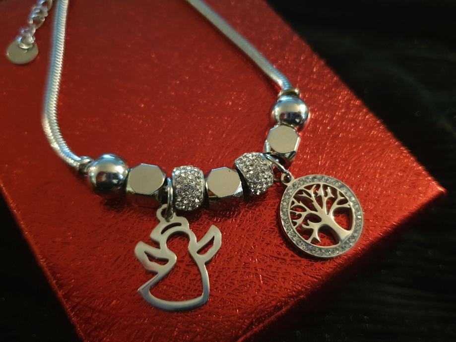 Narukvica je personalizirana što znači da birate privjeske na njoj (slovo, djetelina, srce, zvijezda, djevojčica, drvo života, anđeo, čudotvorna medaljica Majka Božja, križić, anđeosko krilo, sidro, zvijezda, sv.Benedikt, jednorog, slonić, sova, šapa, obitelj, djevojčica i dječak, itd.)