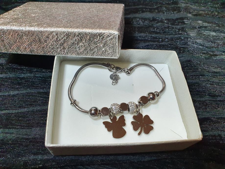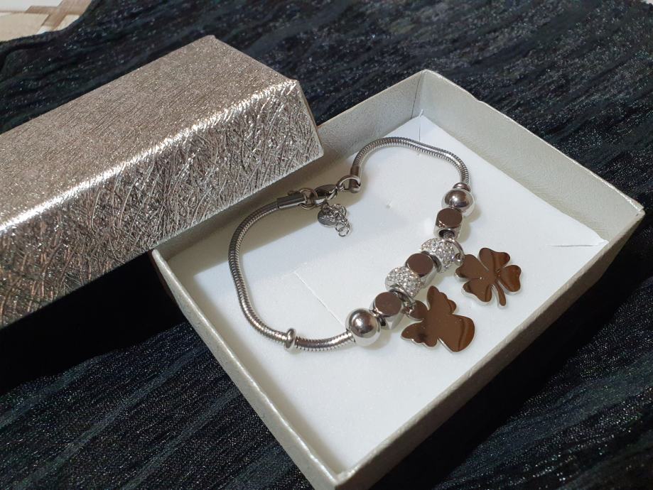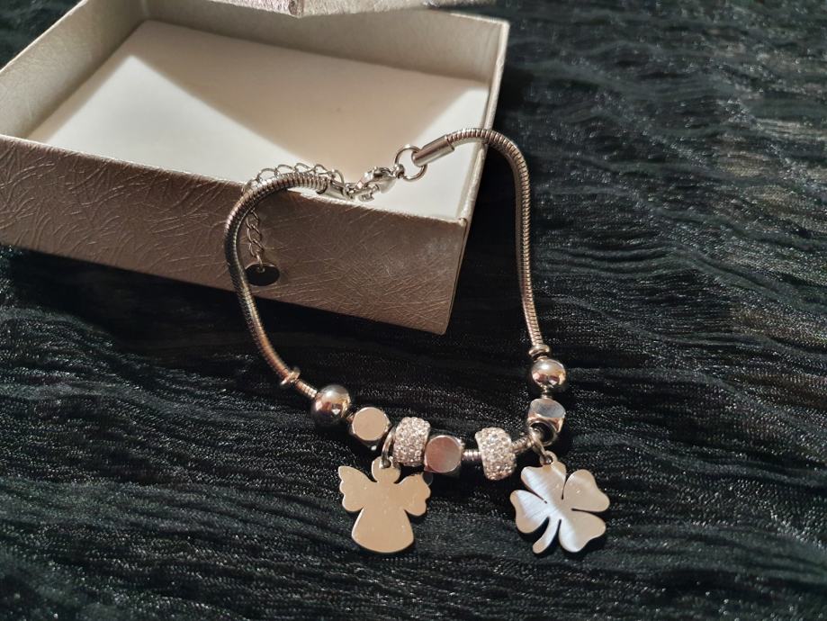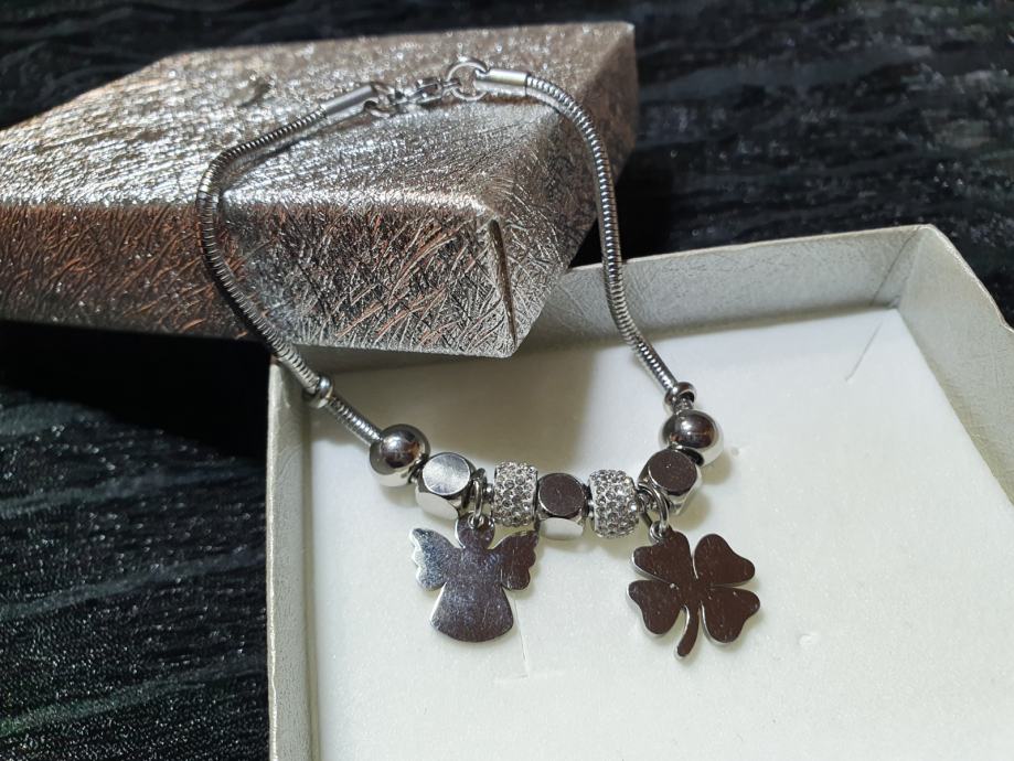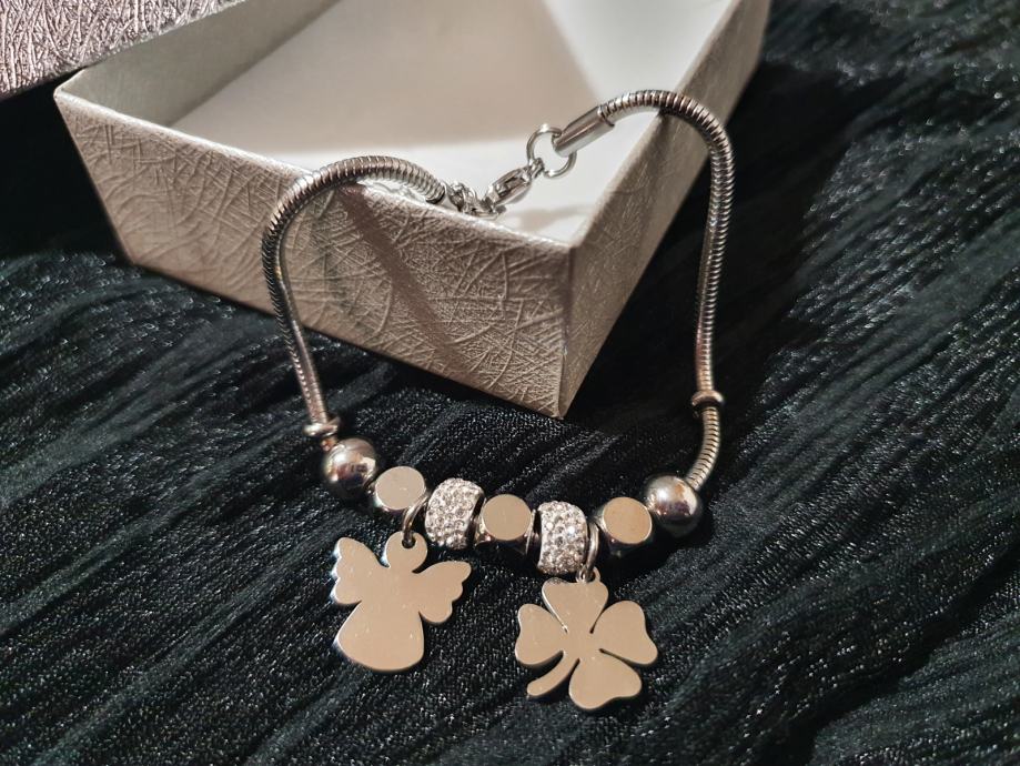 Narukvica je personalizirana što znači da birate privjeske na njoj (slovo, djetelina, srce, zvijezda, djevojčica, drvo života, anđeo, čudotvorna medaljica Majka Božja, križić, anđeosko krilo, sidro, zvijezda, sv.Benedikt, jednorog, slonić, sova, šapa, obitelj, djevojčica i dječak, itd.)