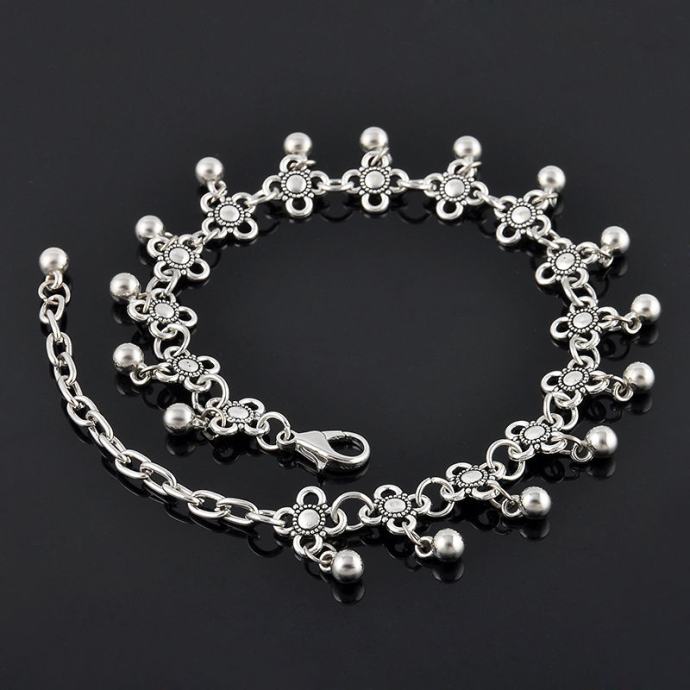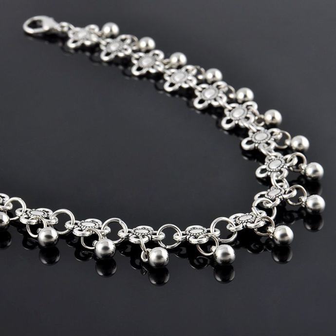 Odlična narukvica za nogu u srebrnoj nijansi s cvjetnim ornamentima i malim kuglicama.