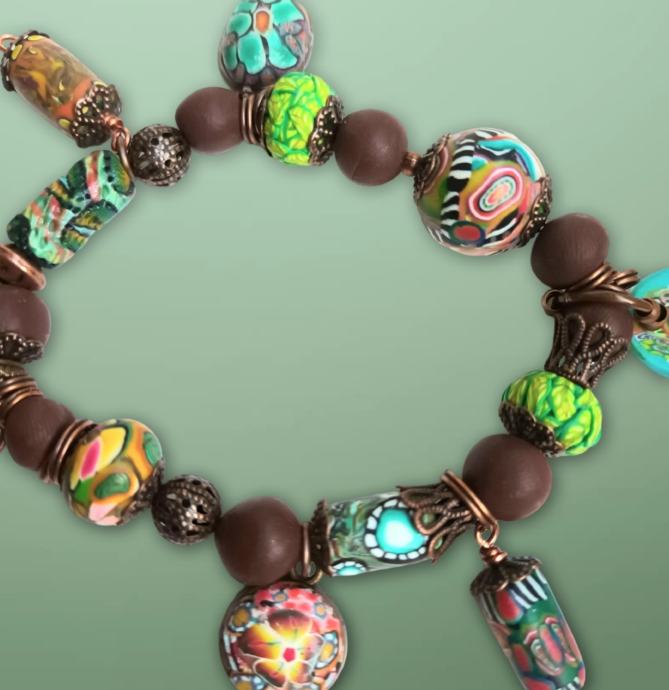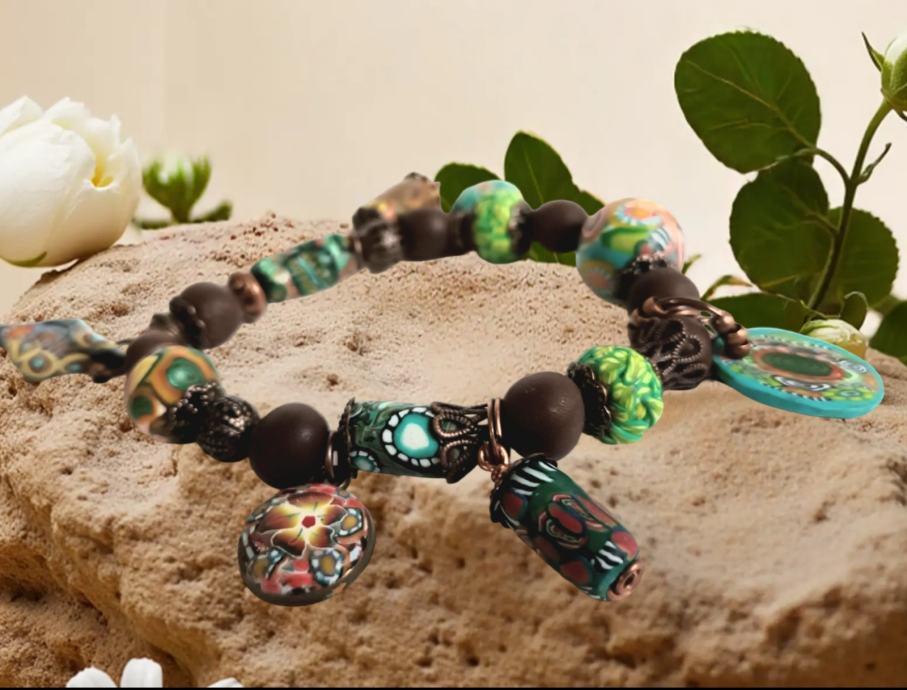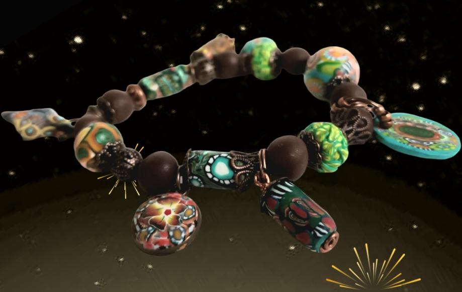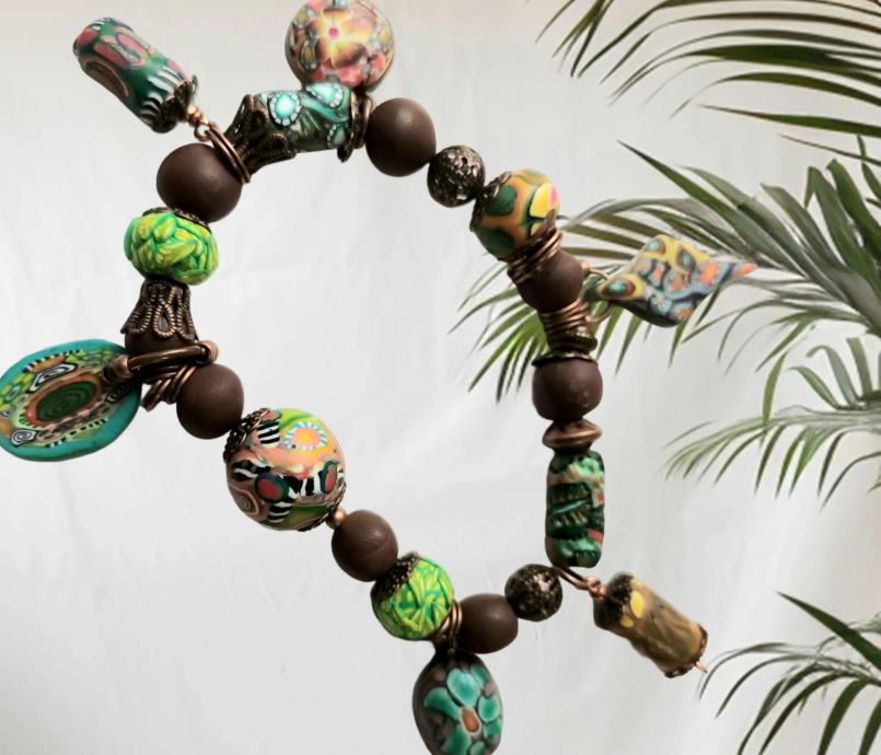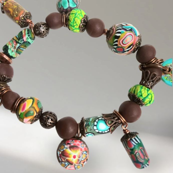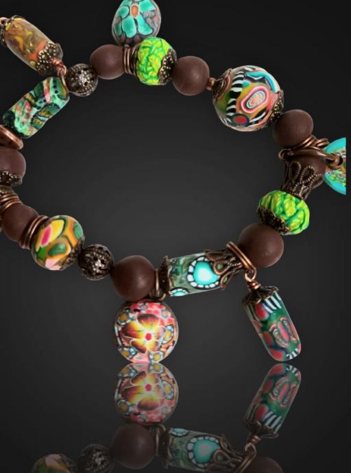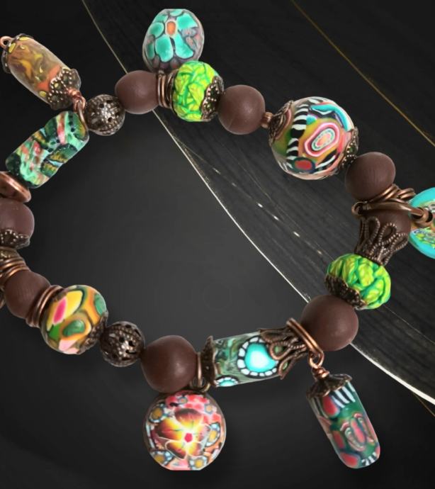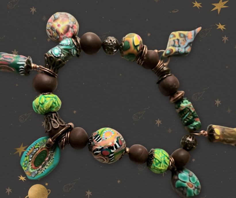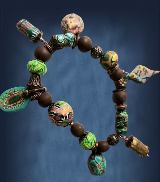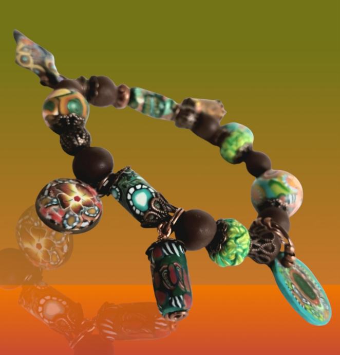 Narukvica od perlica polimerne gline ručno rađenih. Ukrašena bakrenim dodacima. Za zglob od 16-18 cm. Perle su spojene elastikom i osigurane zaštitnim čvorom. Unikat.