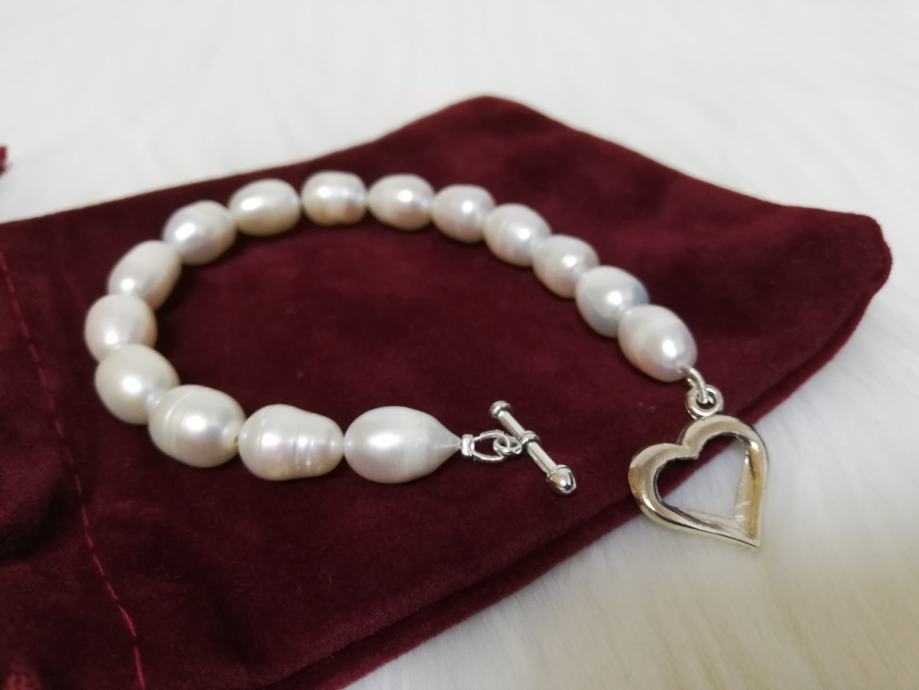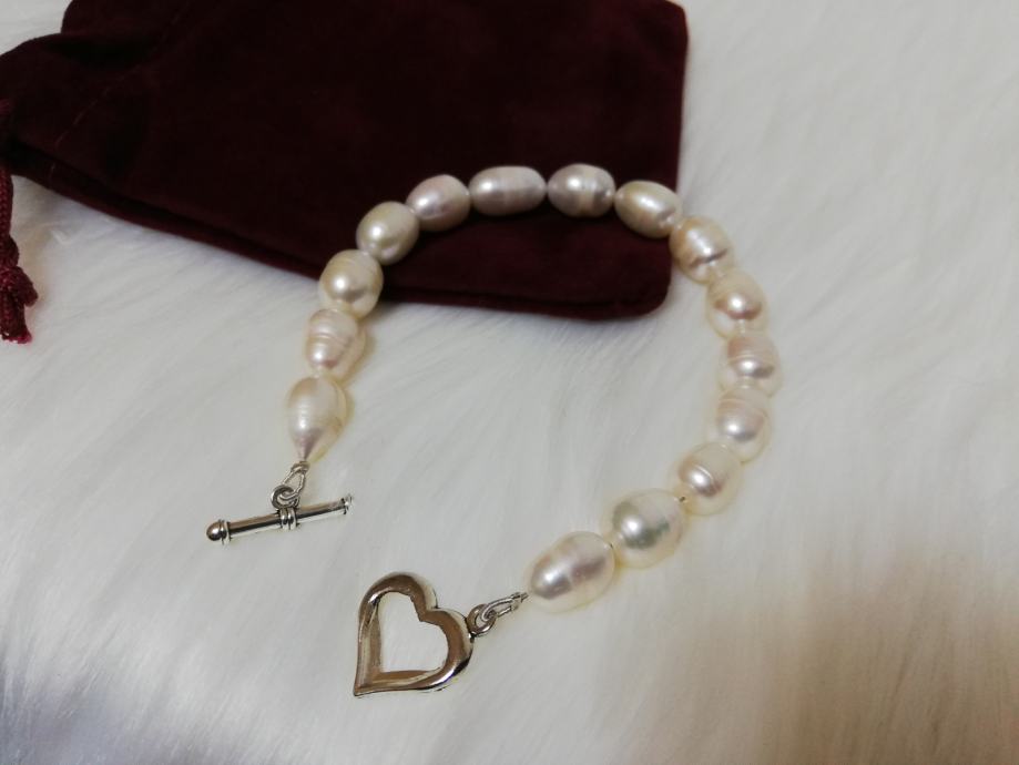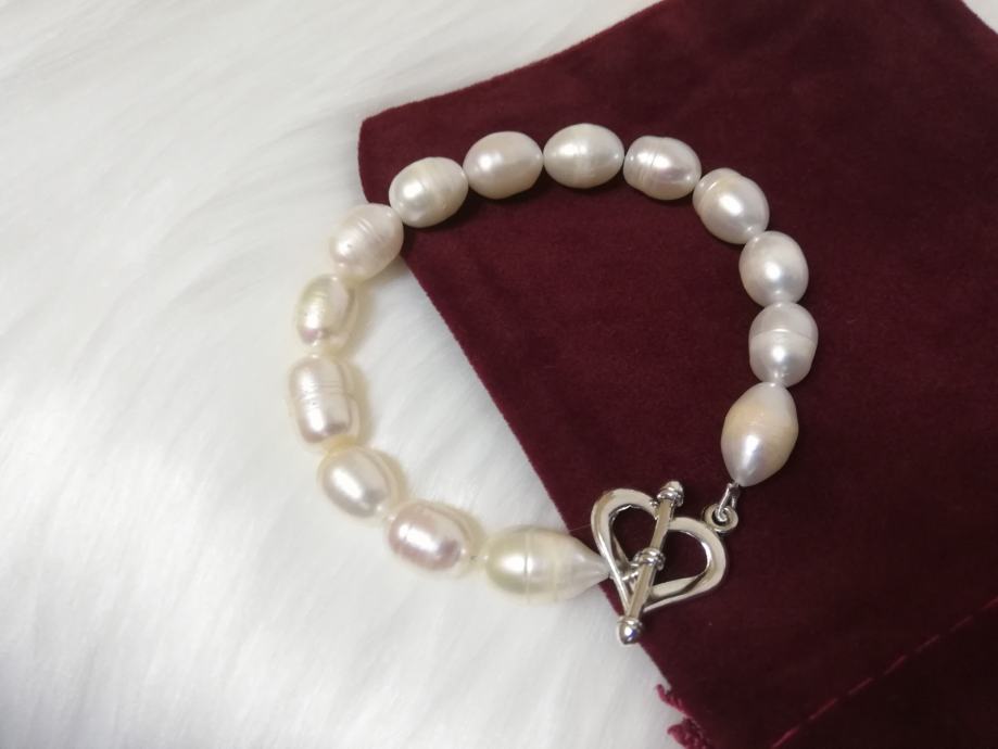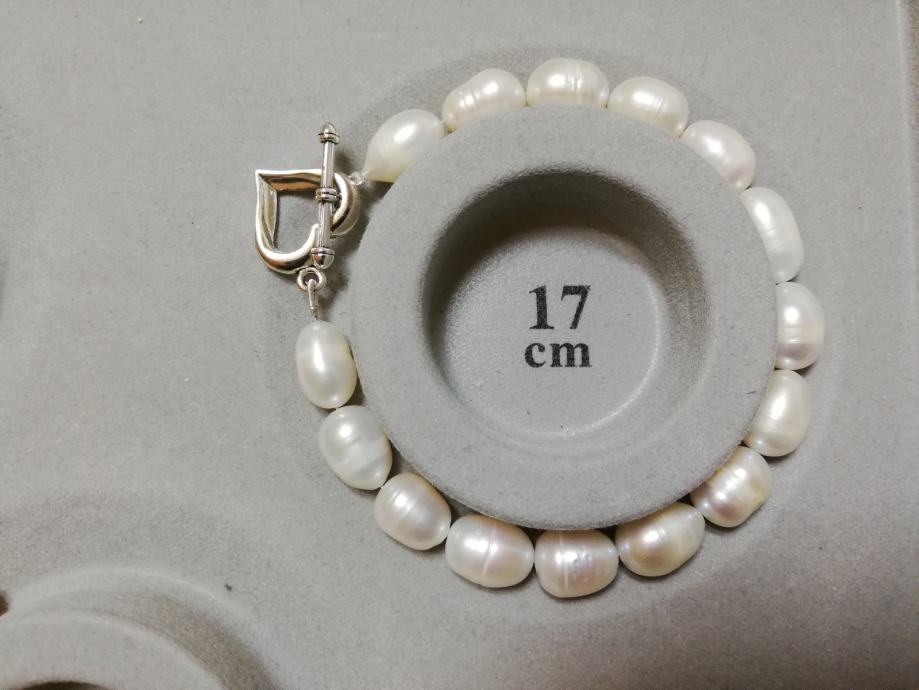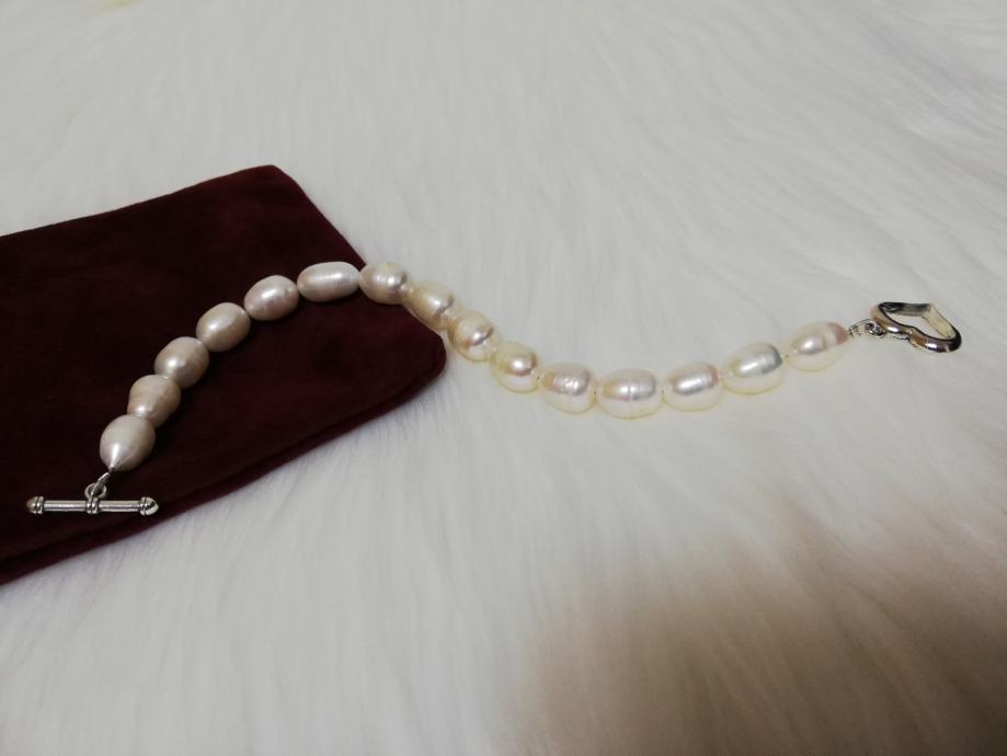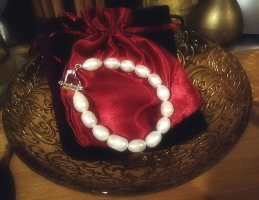 iz osobne kolekcije dugo skupljanog nakita prodaje se nekorištena narukvica od prirodnih rječnih bisera iz uzgoja, ovalni duguljasti, prirodno nepravilnih oblika.