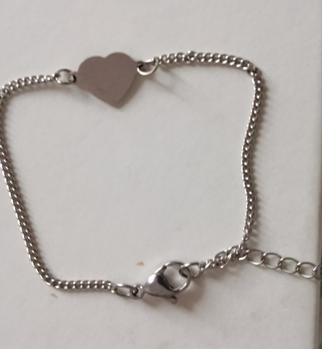 Narukvica "Silver heart" od nehrđajućeg čelika, Radi se o tankom lančiću srebrne boje s privjeskom u obliku srca. Narukvica ima karabin kopču s produžetkom za podešavanje duljine.