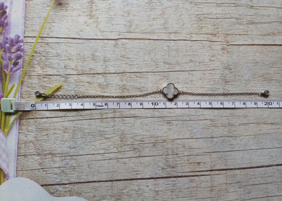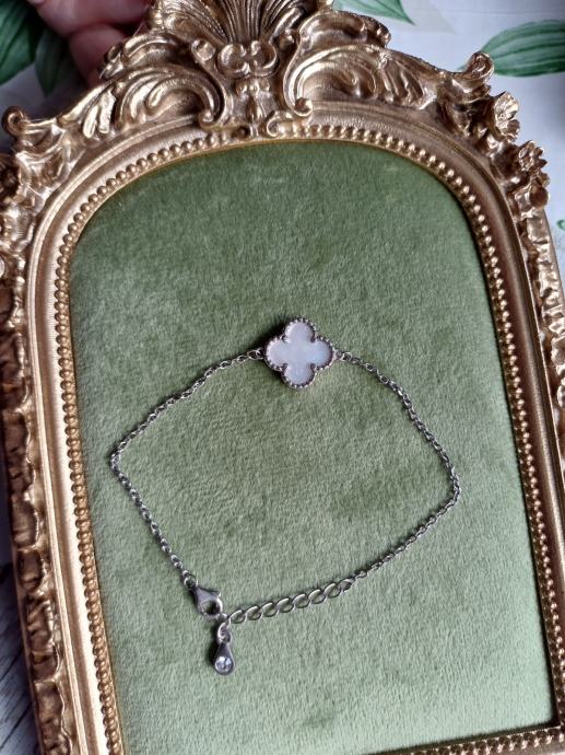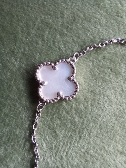 Narukvica od srebra 925 s privjeskom od sedefa u obliku djeteline. Nošena nekoliko puta, očuvana.