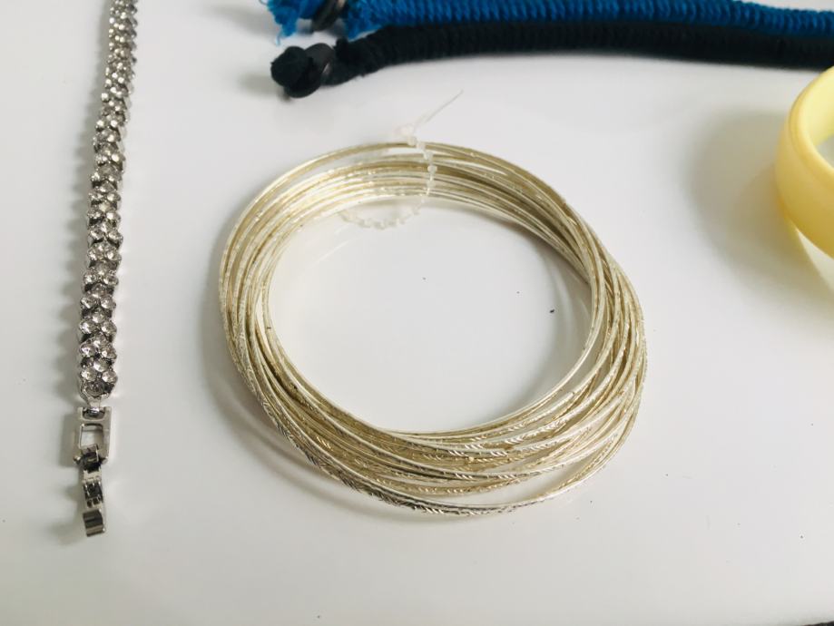 2 Pletene narukvice (crna i plava) su zajedno 35kn; LOT srebrnih narukvica je 19kn; 2 Narukvice (žuta i tirkiz) su zajedno 25kn; Srebrnkasta pletena narukvica sa srcima je 69kn; a 3 narukvice (sa zadnje slike) kojima se treba još dodati kopča - svaka POJEDINAČNO je 39kn.