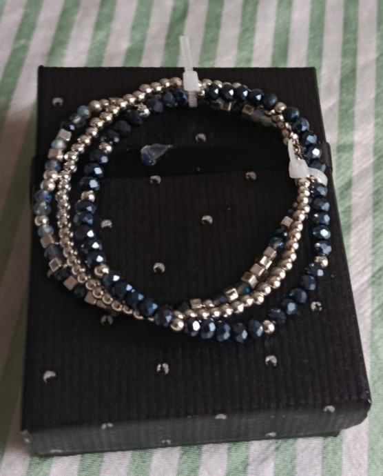 Set od tri elastične narukvice s perlicama u plavoj, tammoplavoj i srebrnoj boji. Ove narukvice su dizajnirane za nošenje u slojevima (tzv. "stacking")