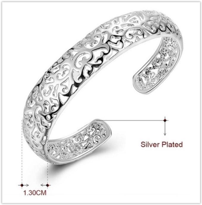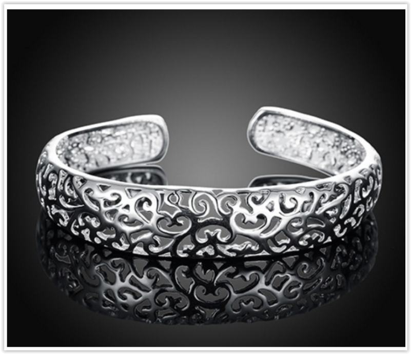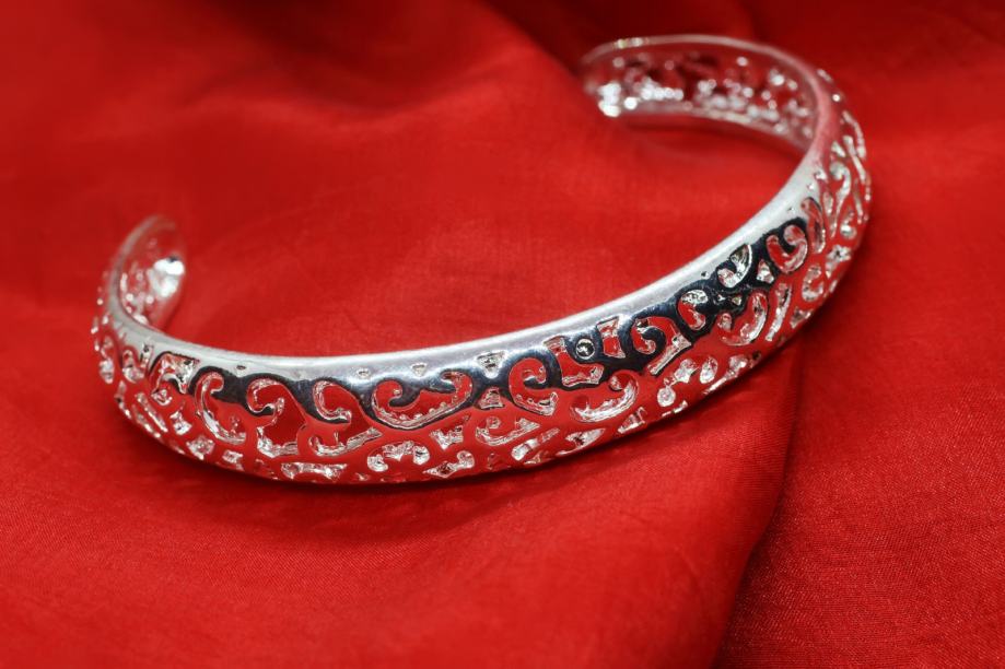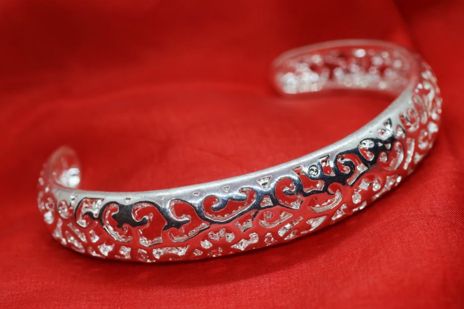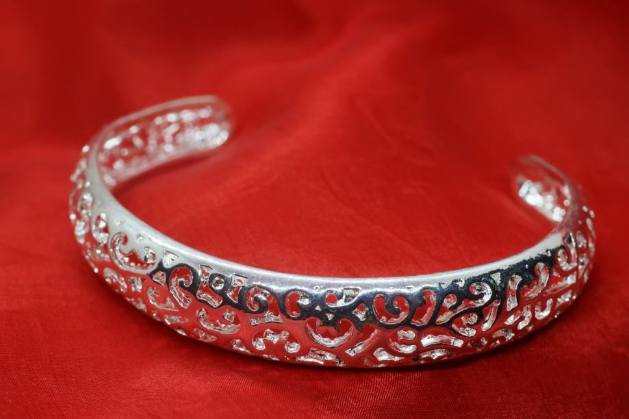 posebno lijepa narukvica sa reljefnim uzorkom, posrebrena 925 sterling srebrom, izuzetno moderna, stane na svaku ruku jer nije potpuno zatvorena.