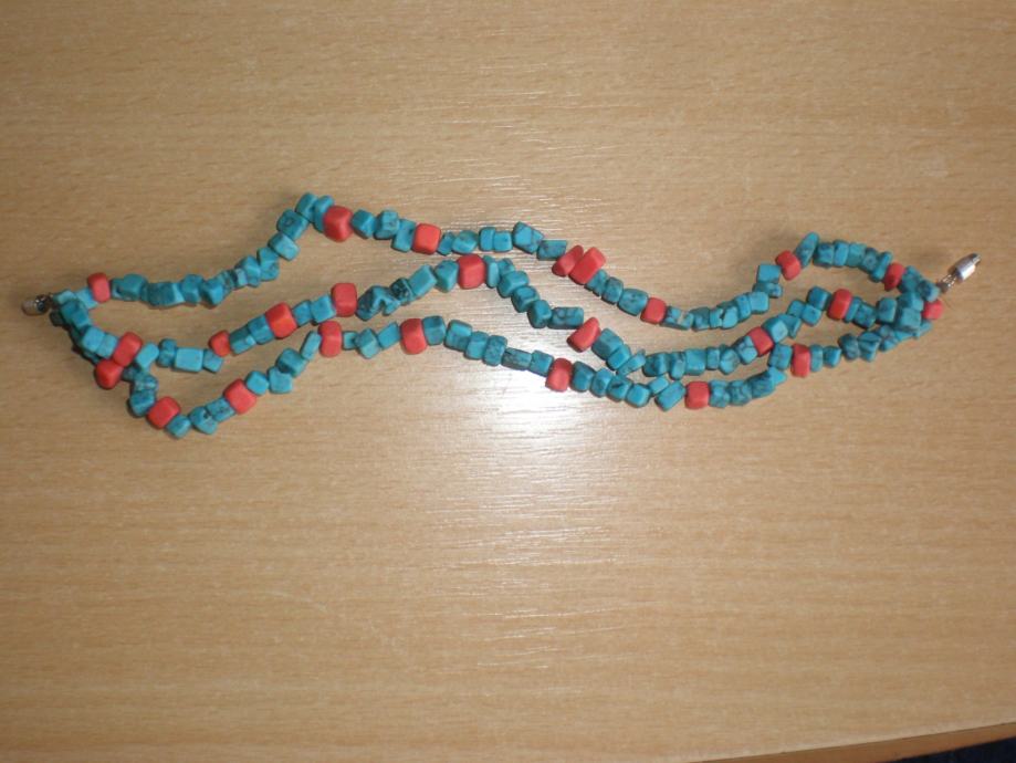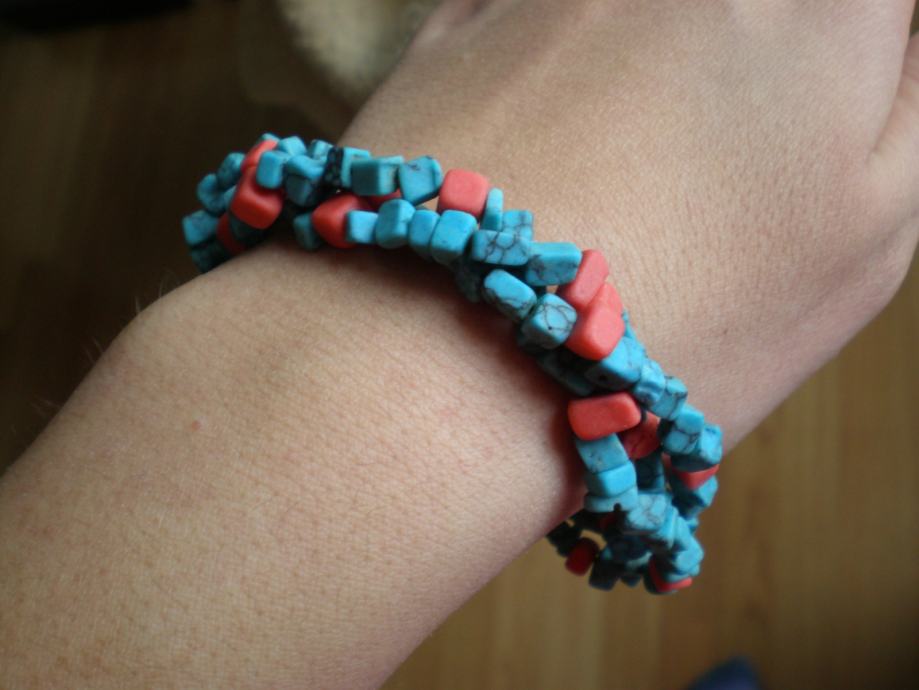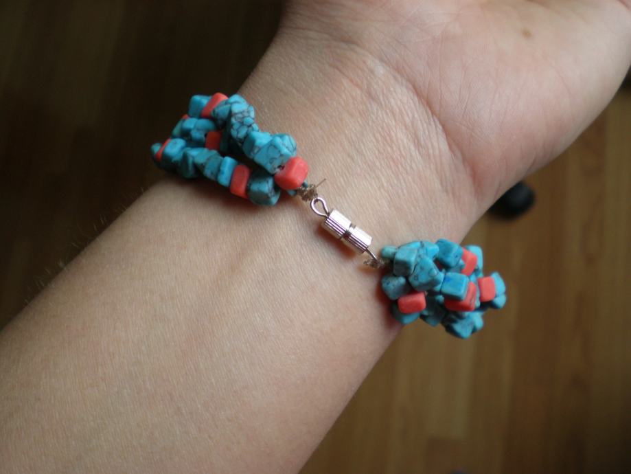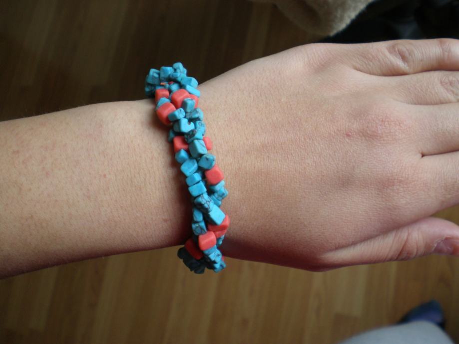 Vesela ljetna narukvica, od plavih i narančastih kamenčića nanizanih u 3 niza, mogu se saviti u spiralu pa izgleda zaniljivije. Malo nošena.
