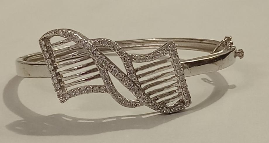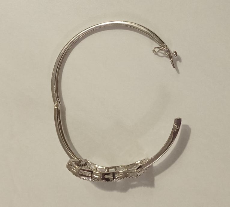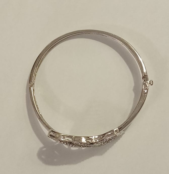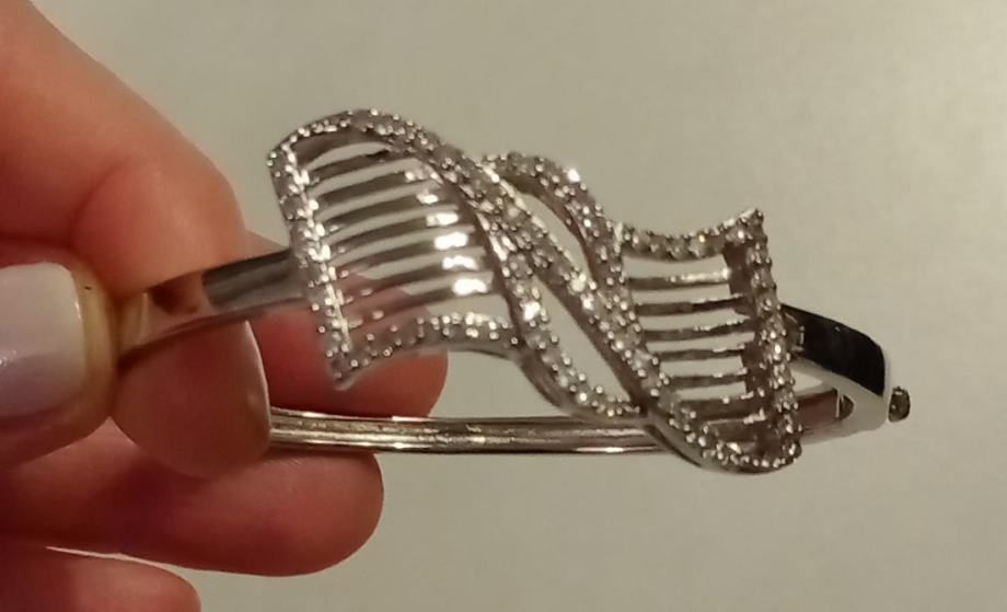 Potpuno nova srebrna narukvica, srebro 925 sa žigom. Narukvica ima vrlo zanimljiv moderan dizajn. Ukrašena je prozirnim cirkonima. Rodinirana je, što znači da ima obradu kakvu ima bijelo zlato.