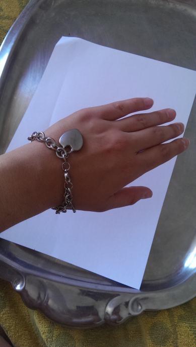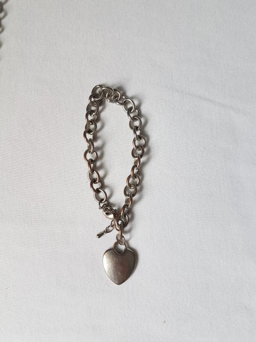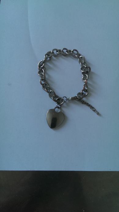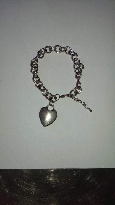 Posrebrena narukvica u obliku lanca, s privjeskom srca. Podesive širine.