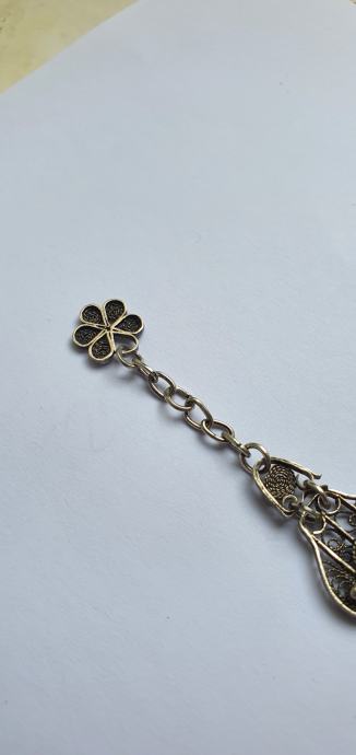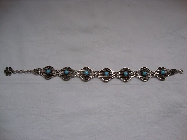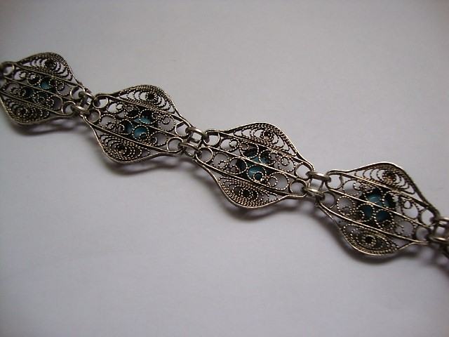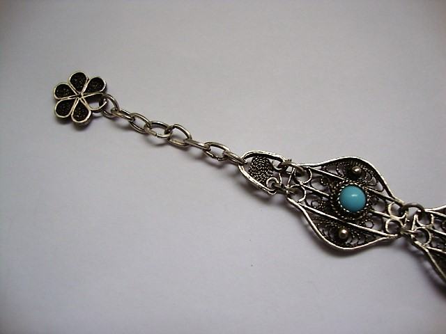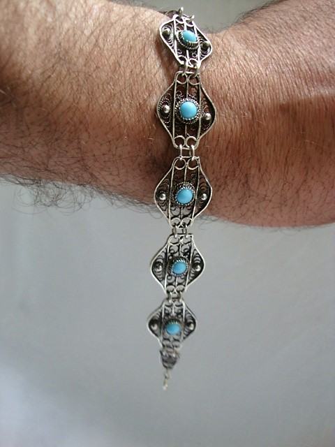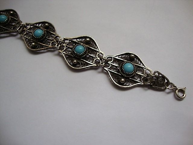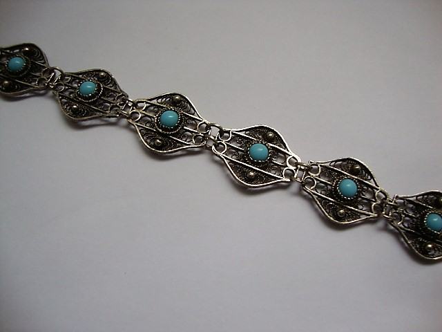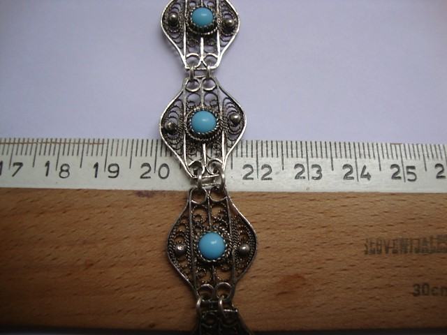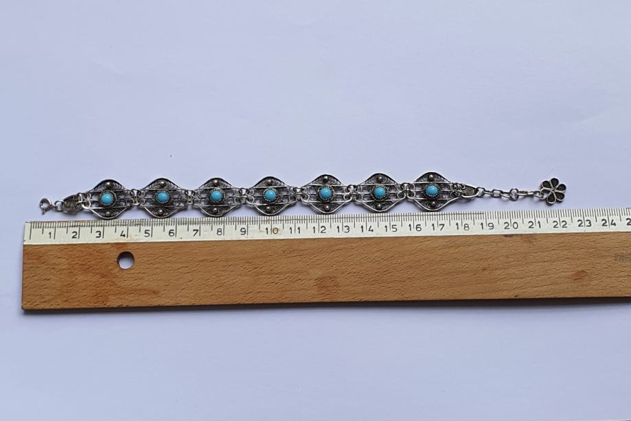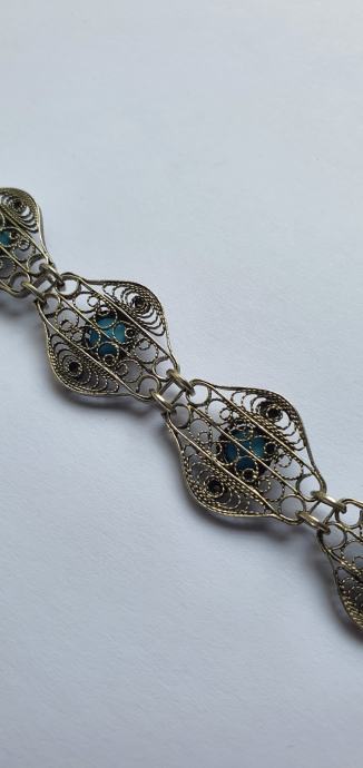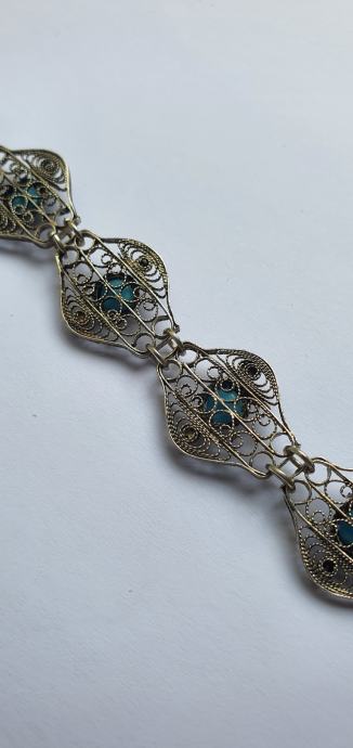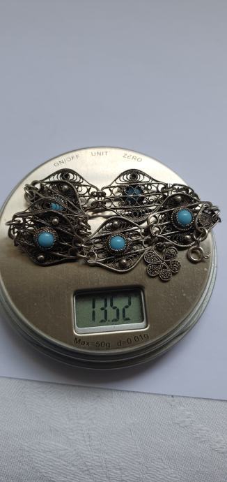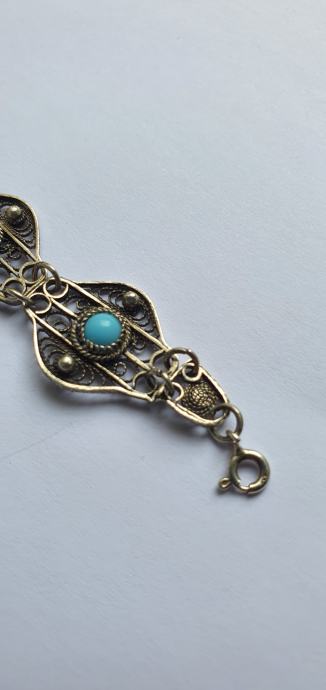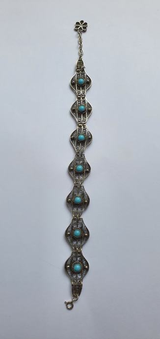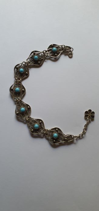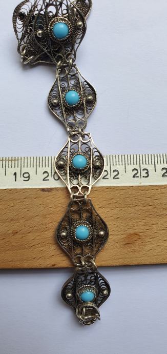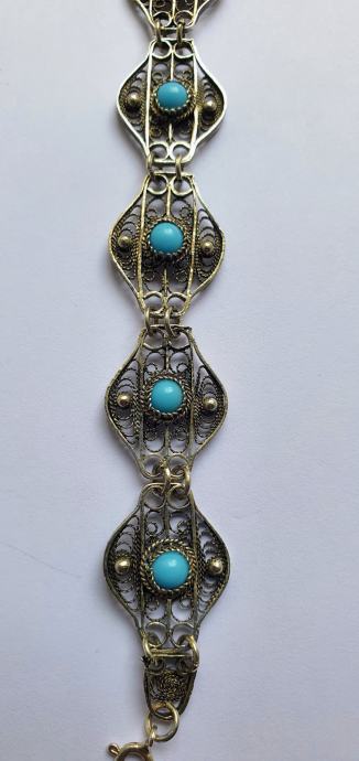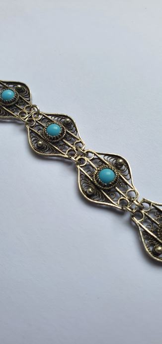 Krasna narukvica ručno izrađena od mnoštvo filigranske mikro žice od srebra ukrašena predivnim tirkiz kamenom