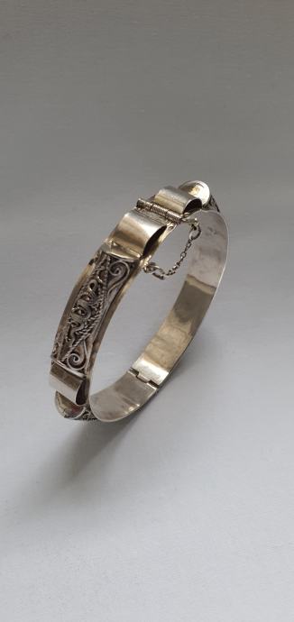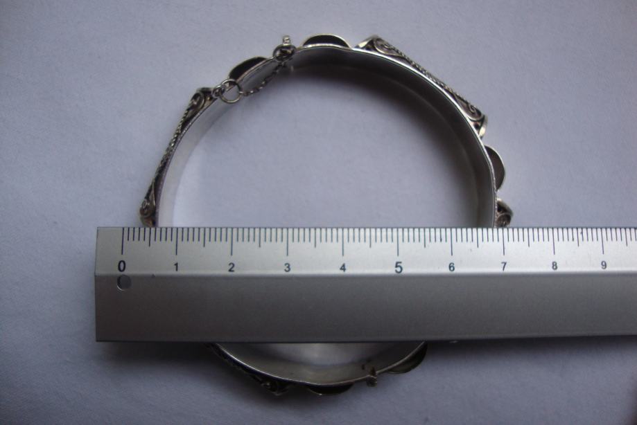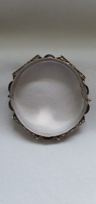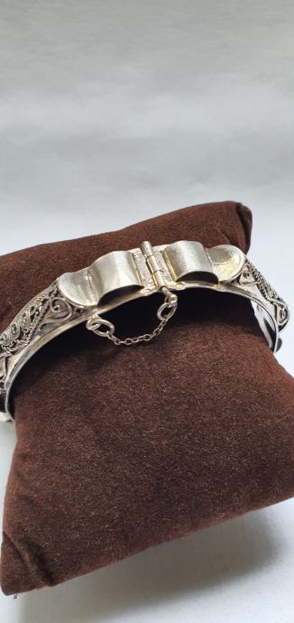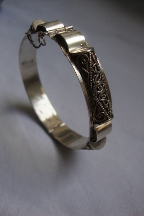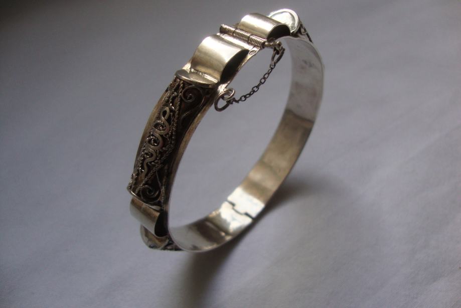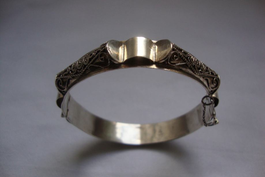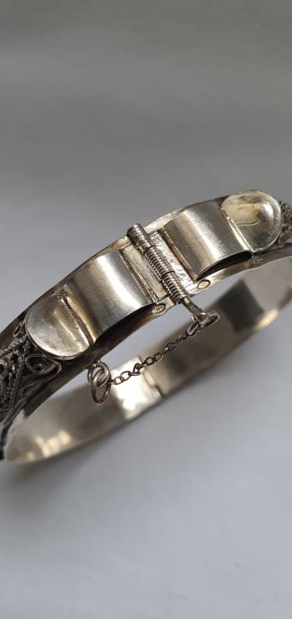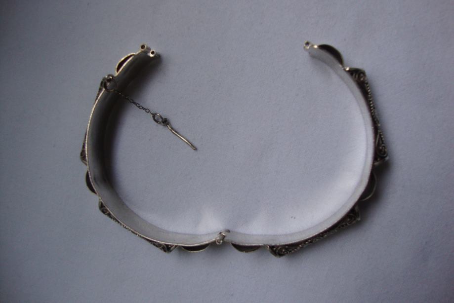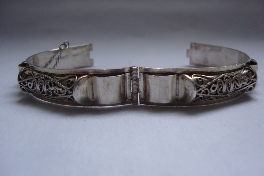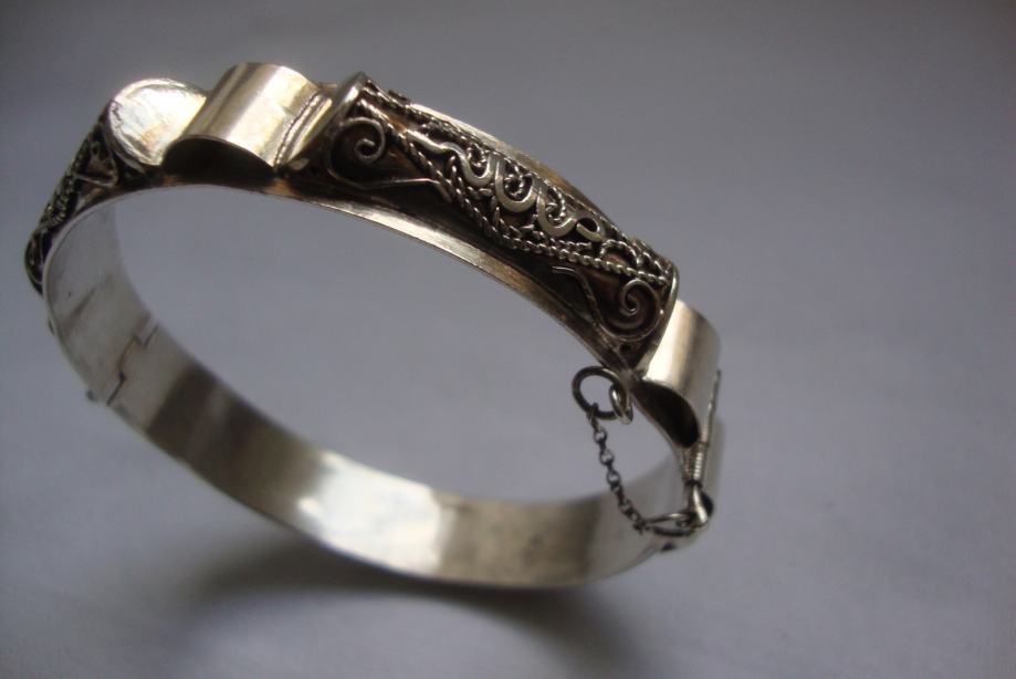 Krasna stara obruč narukvica ručni rad u srebru 925 vrlo zanimljiv ručni rad kombinacija geometrijskih zaobljenih dijelova ukrašeno filigranskom žicom marokanski ručni rad sigurnosna kopća sa uvlakačem na lančiću slikovni žigovi odma do kopće sa obje strane