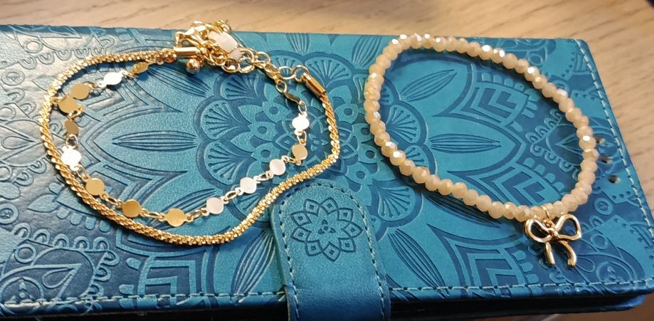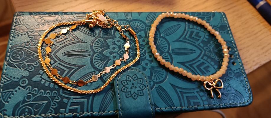 dvije su zlatne boje i vizualno jako sliče zlatu i svaka je posebna na svoj način. Kopčaju se klasičnom karabin kopčom. Treća je elastična od nanizanih perlica u bež boji decentnog sjaja sa privjeskom u obliku zlatne mašnice.
