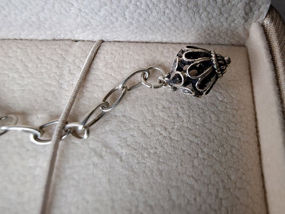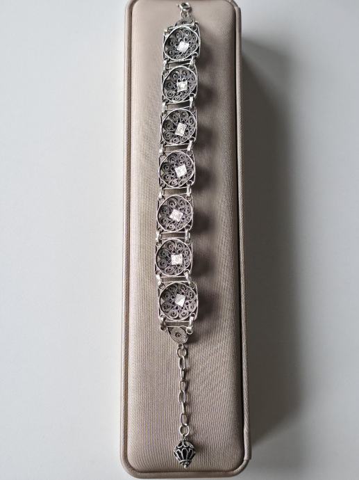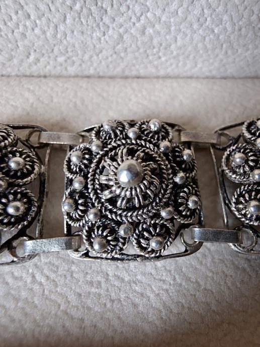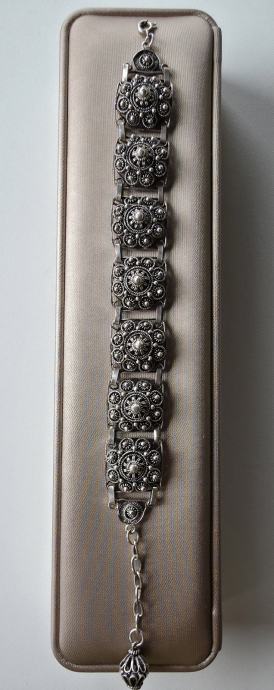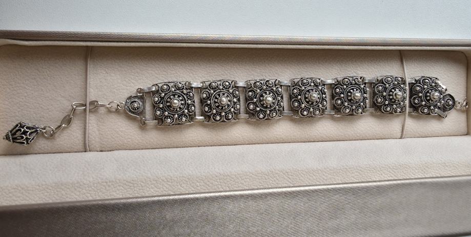 Motiv: središnji dio svakog kvadratnog članka je polukugla, izrađena od tankih srebrnih niti (filigran) i sitnih kuglica. Iako su originalni botuni okrugli, ovdje su umetnuti u kvadratne okvire, što je česta varijacija u izradi nakita kako bi se dobila šira i bogatija narukvica.