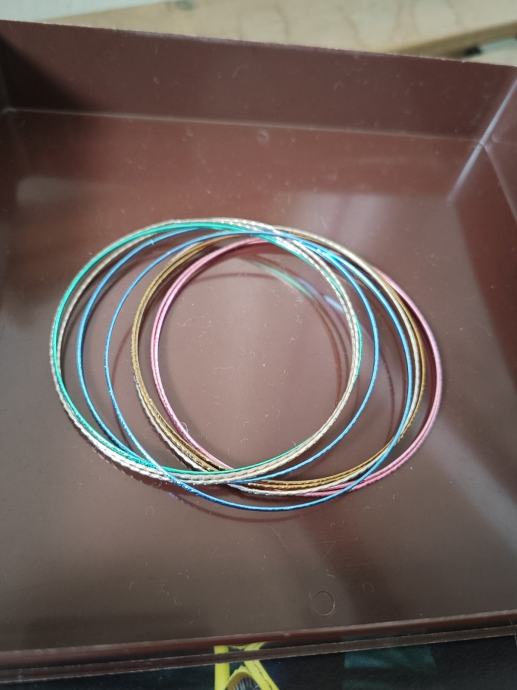Više tankih šarenih raznobojnih metalnih narukvica - bižuterija