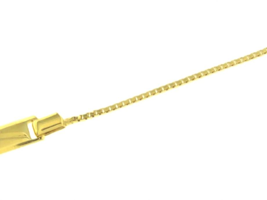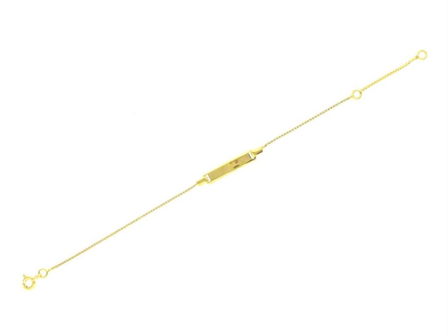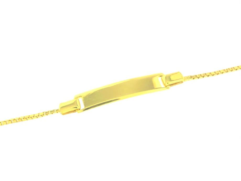 Zlatna dječja narukvica s pločicom, tanki venecijaner vez s glat pločicom za gravuru, žuto zlato 14K, žig 585.