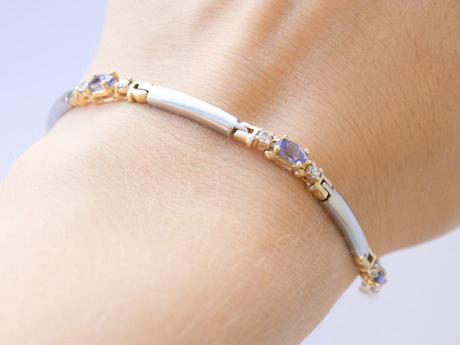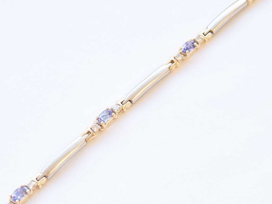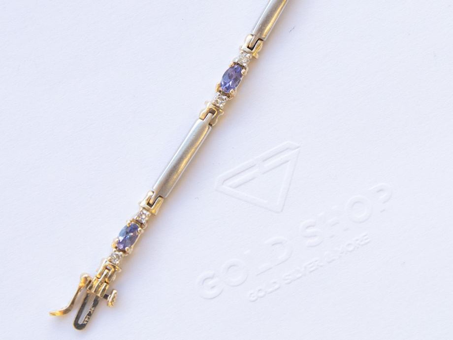 Zlatna narukvica, lux segmentirana s mat bijelim dužim oblim segmentima i kraćim žutim s dijamantima i tanzanitima, žuto-bijelo zlato 14K, štambilj 585, sigurnosna "osmica" za zakapčanje.