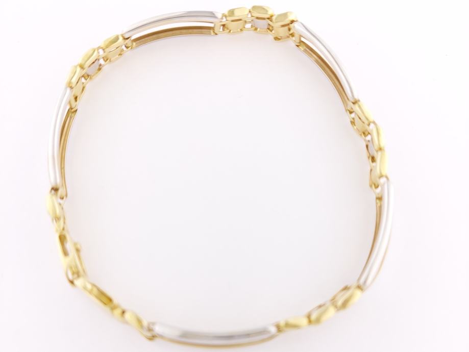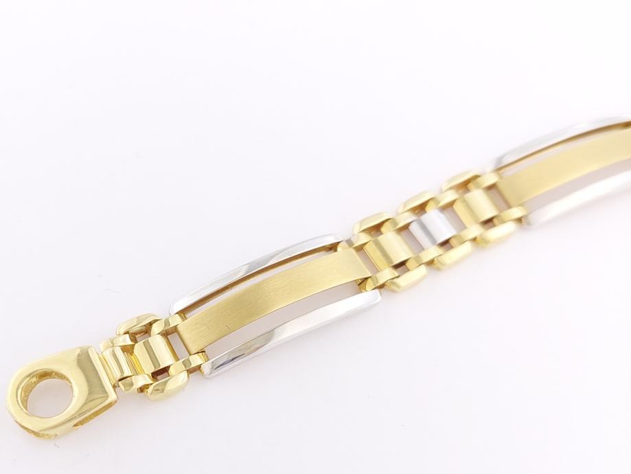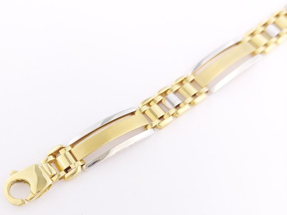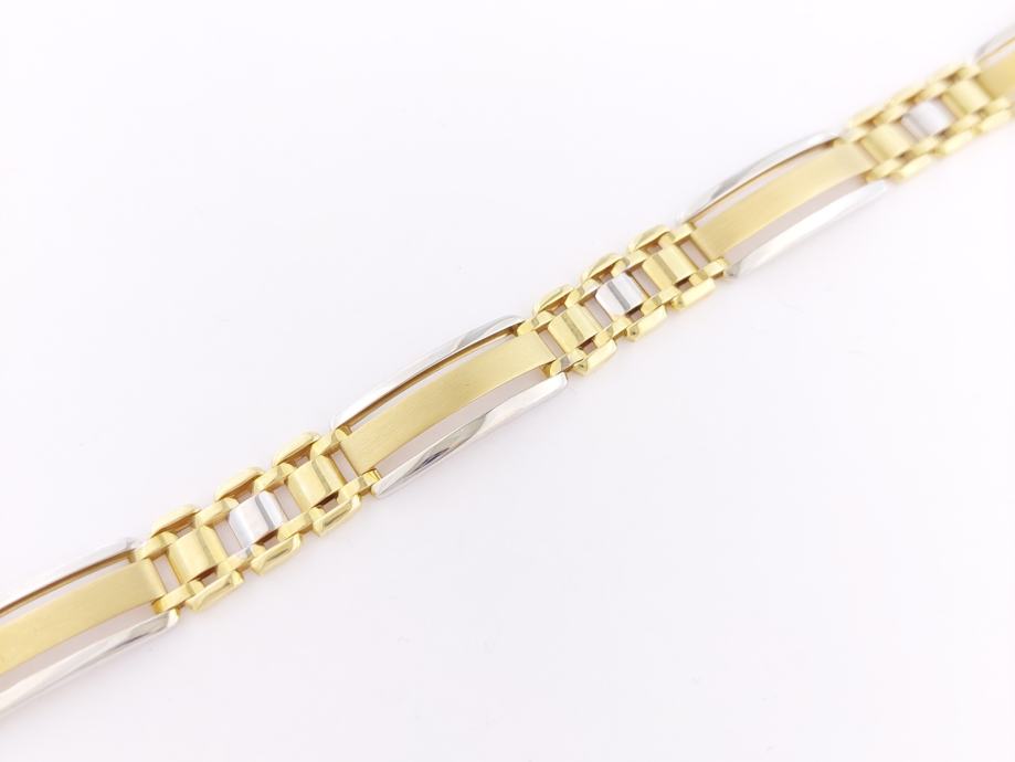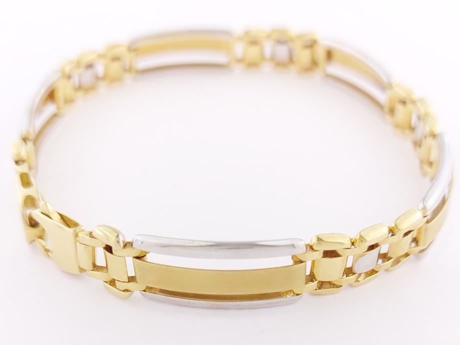 Zlatna narukvica, muška, kombinacija žuto-bijelo zlato, mat žute pločice, glat bijele cjevčice, 14K, žig 585.