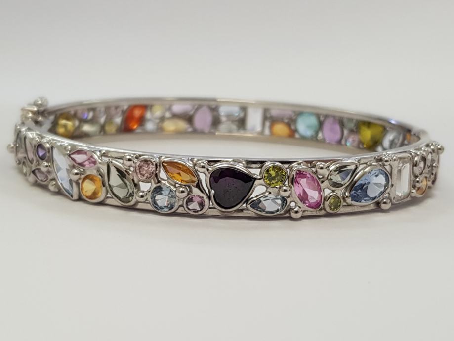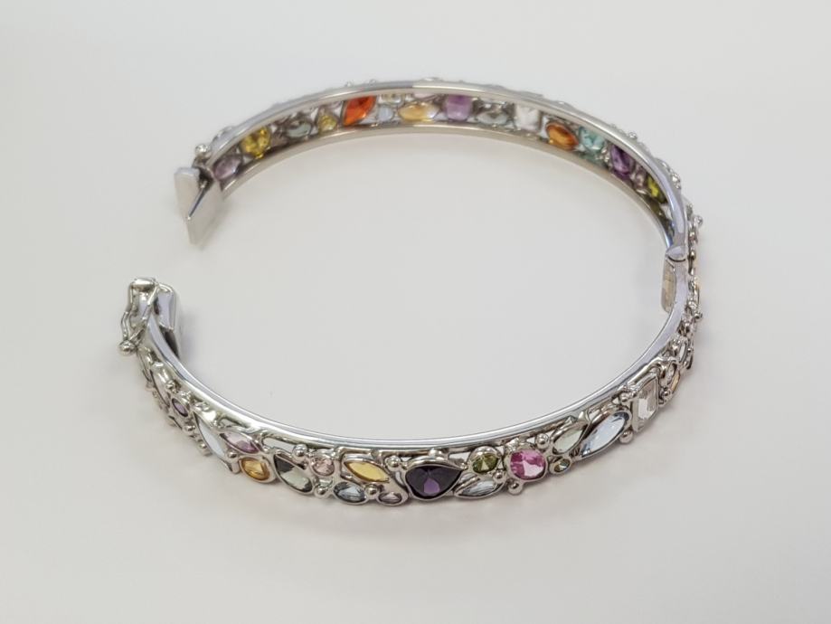 Zlatna narukvica, ženska, ring 18 karatno bijelo zlato, poludragi kamenčići u različitim bojama i oblicima, unikatan ručni rad, žig 750.