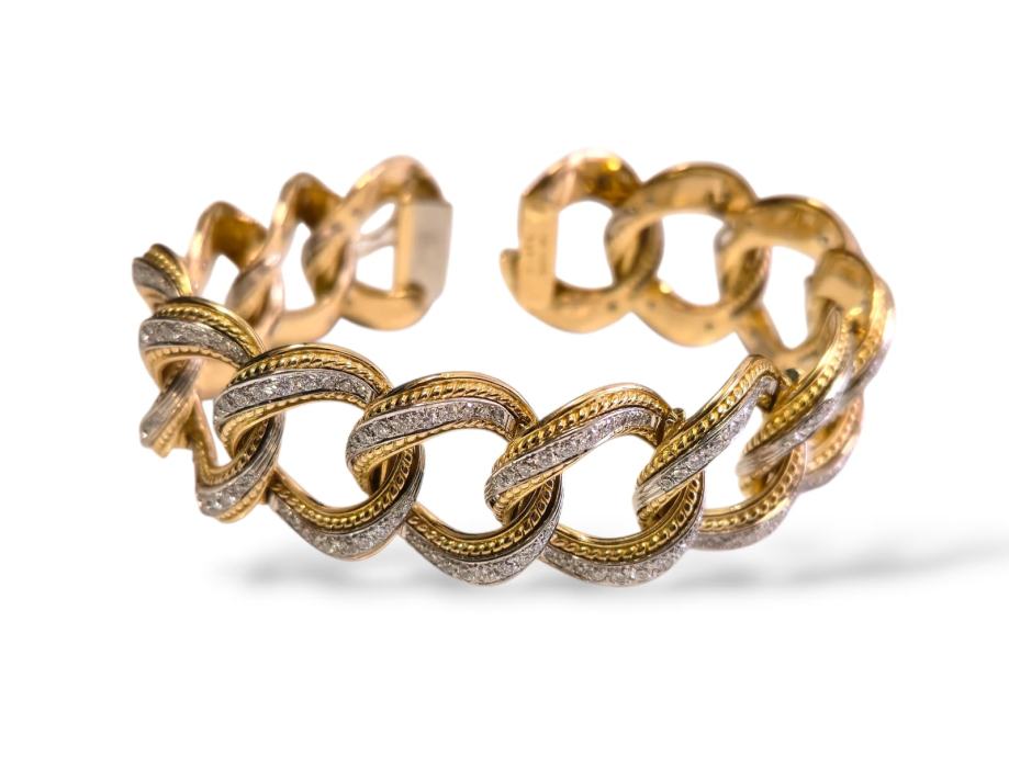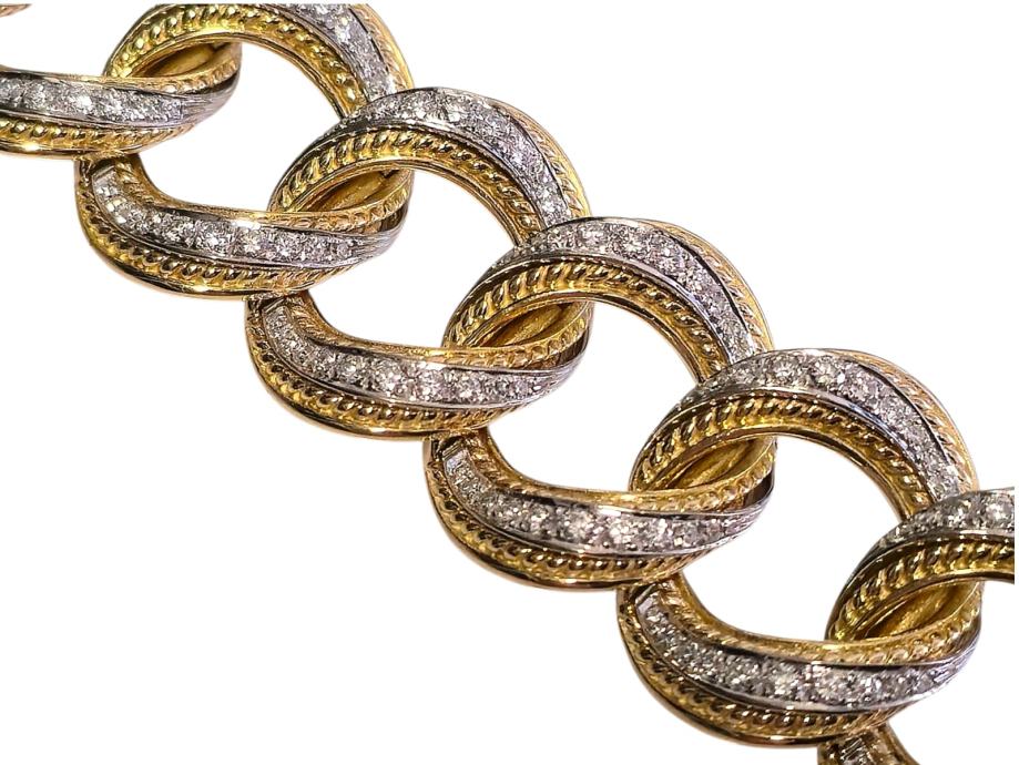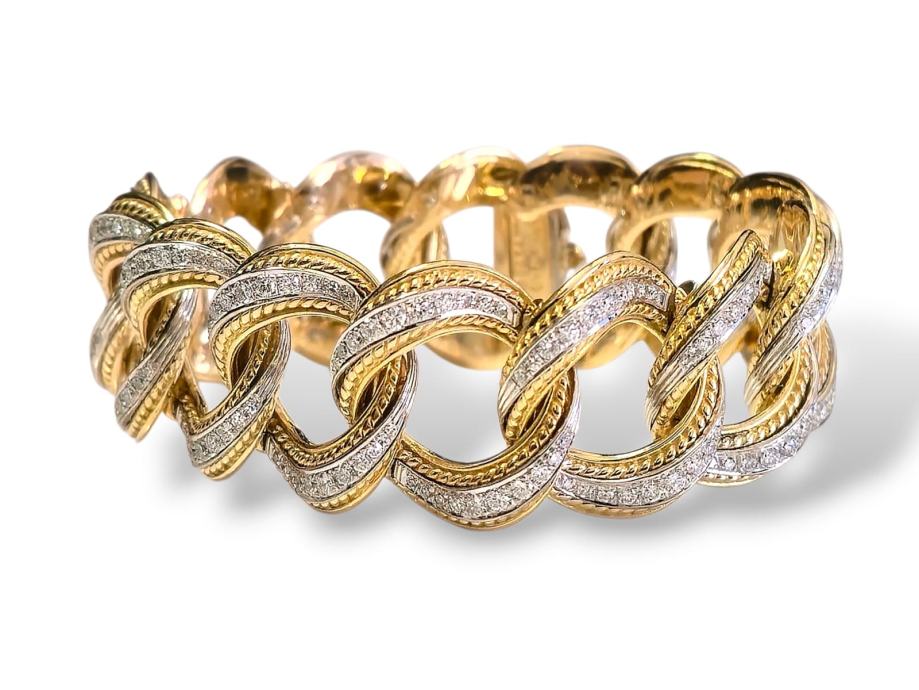 Prodajemo narukvicu od kombinacije bijelog i žutog 18 karatnog zlata sa 280 dijamanata brilliantnog brusa.