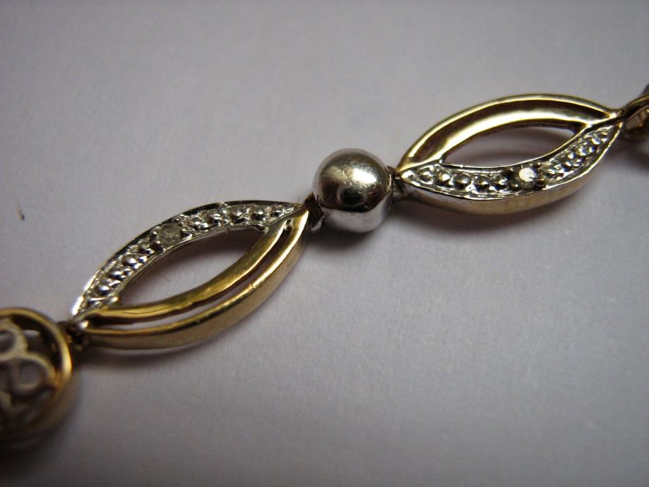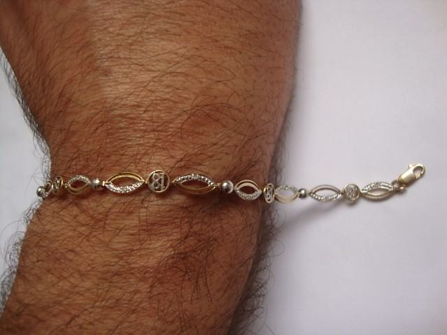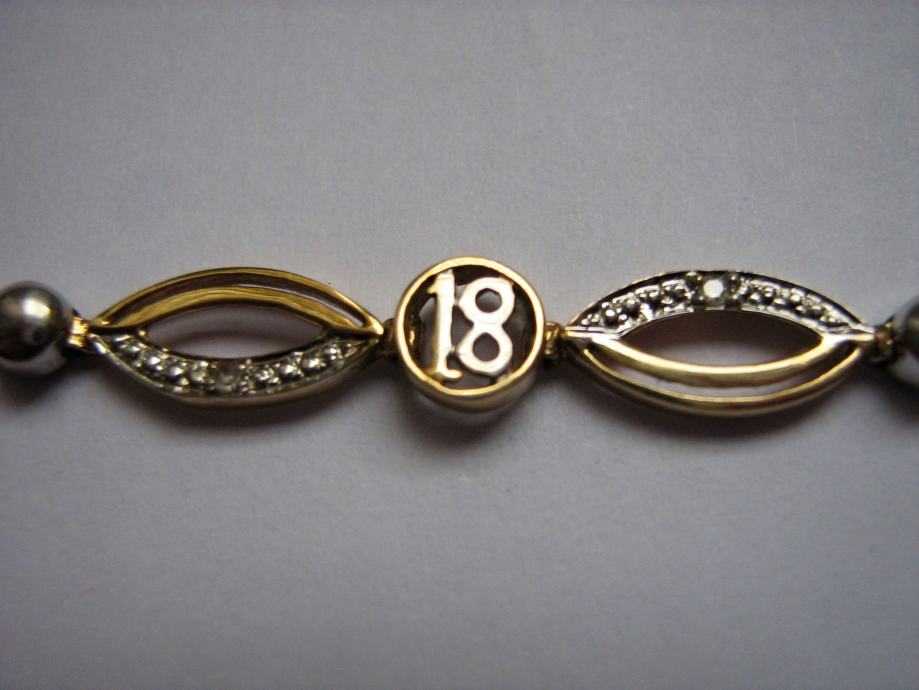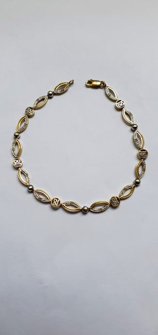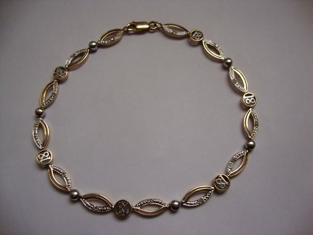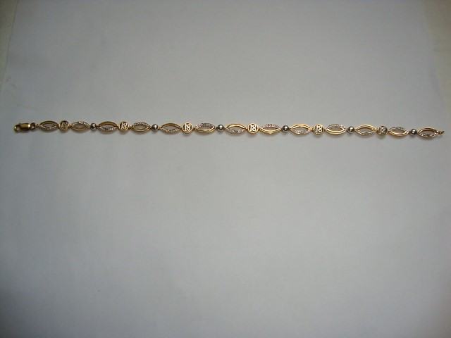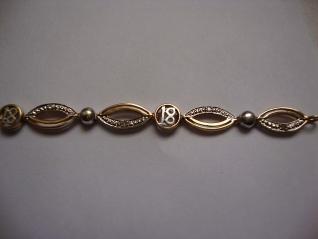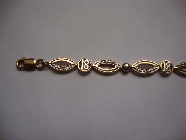 Narukvica je izrađena u kombinaciji žutog i bijelog zlata ukrašena kamenčićima i brojem 18 na 6 alkica nježna i vesela srećonoša ili za darivanja povodom 18. rođendana