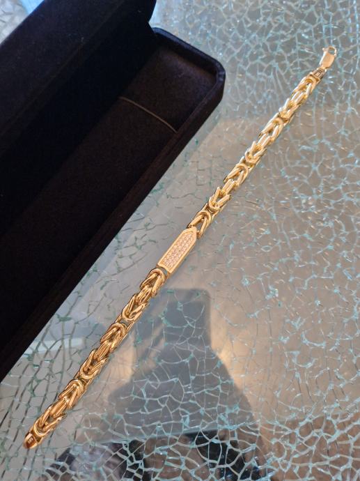ZLATNA NARUKVICA KRALJEVSKI VEZ dizajnerska od 14 karatnog zlata (585) dužina lančića je 24.5 cm i širina 0,8 cm, a težina 30,15 g. Cijena narukvice je 3050 eura (zadnja cijena). Izuzetno lijepa i unikatna narukvica u kombinaciji žutog žlata i cirkona. Za preuzimanje i više informacija nazovite 0038630414258 ( MOŽE I WHATSUP )