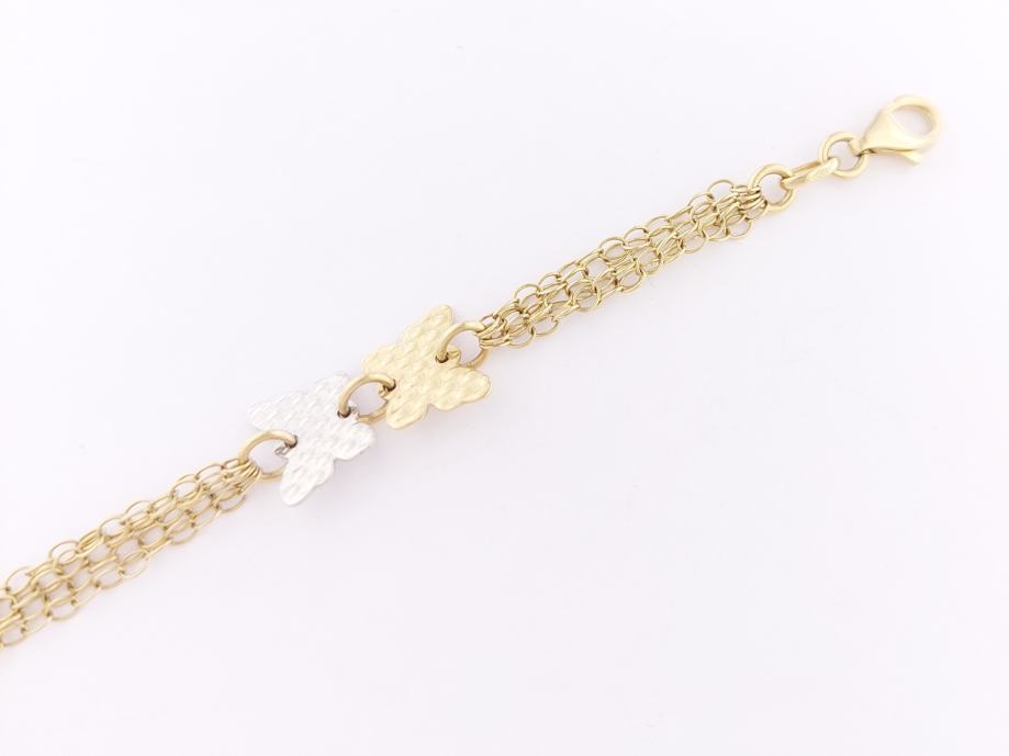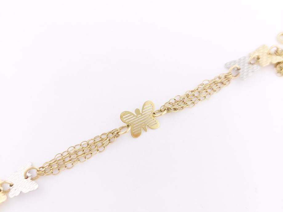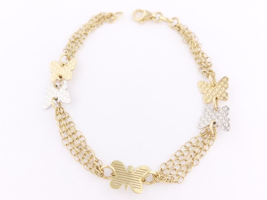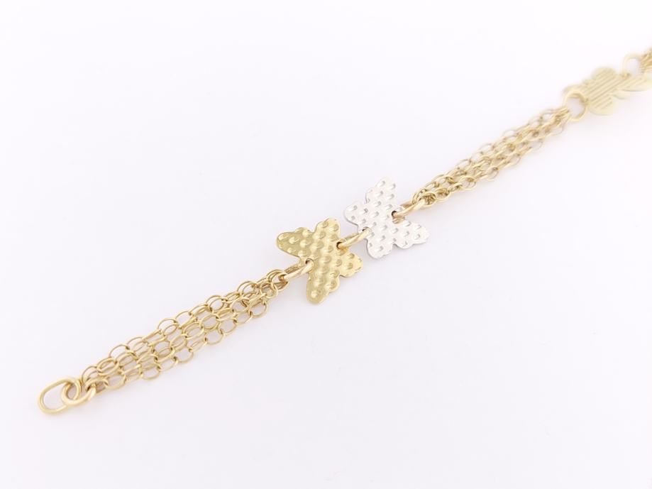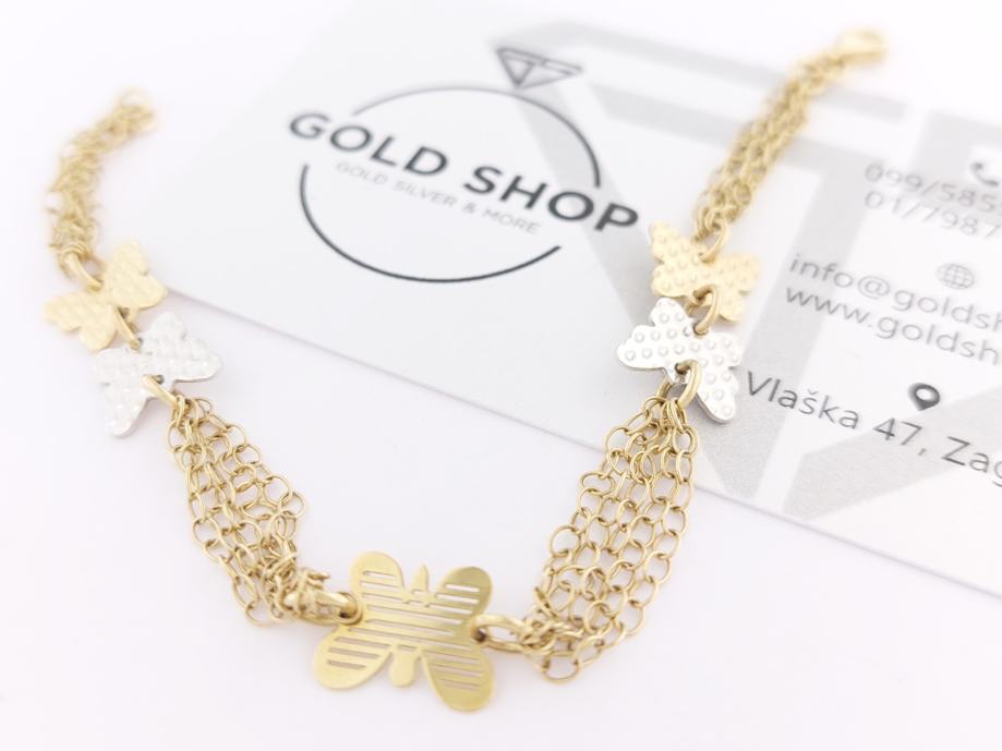 Zlatna narukvica, ženska, kombinacija žuto-bijelo zlato 14K, žig 585, kare 5-erostruki vez, 5 leptirića na narukvici.