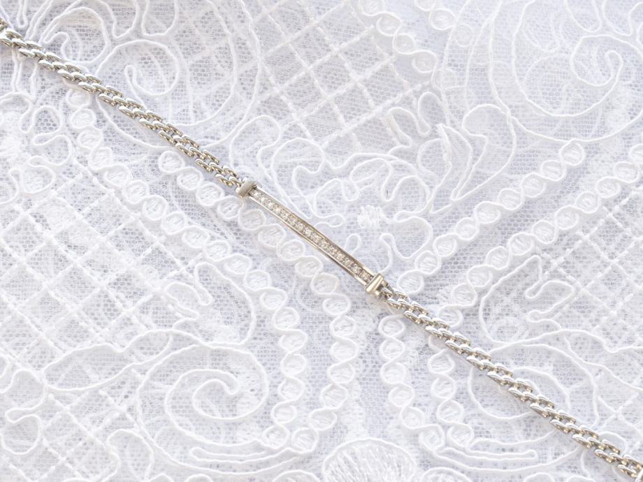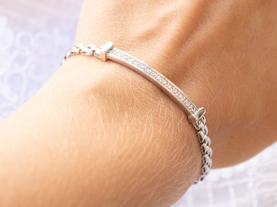 Zlatna narukvica, ženska, bijelo zlato 14K, štambilj 585, lux s pločicom, bijeli cirkoni.