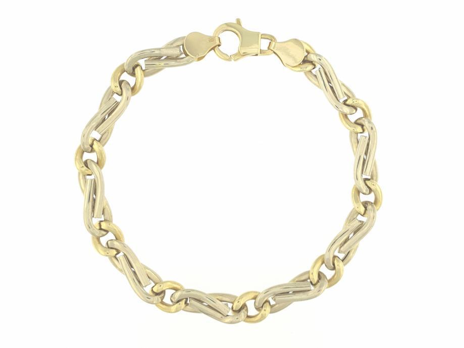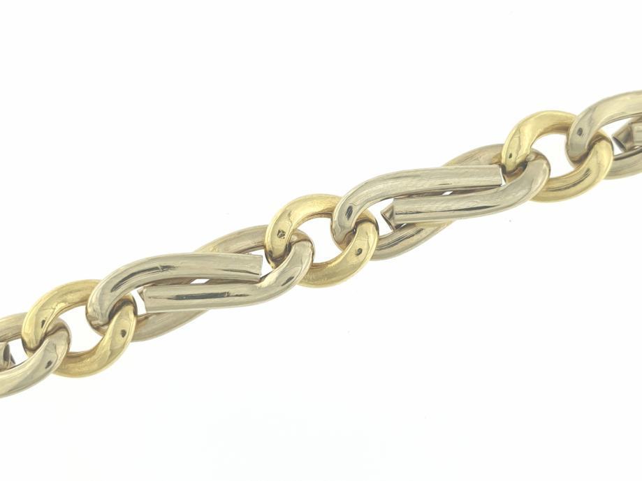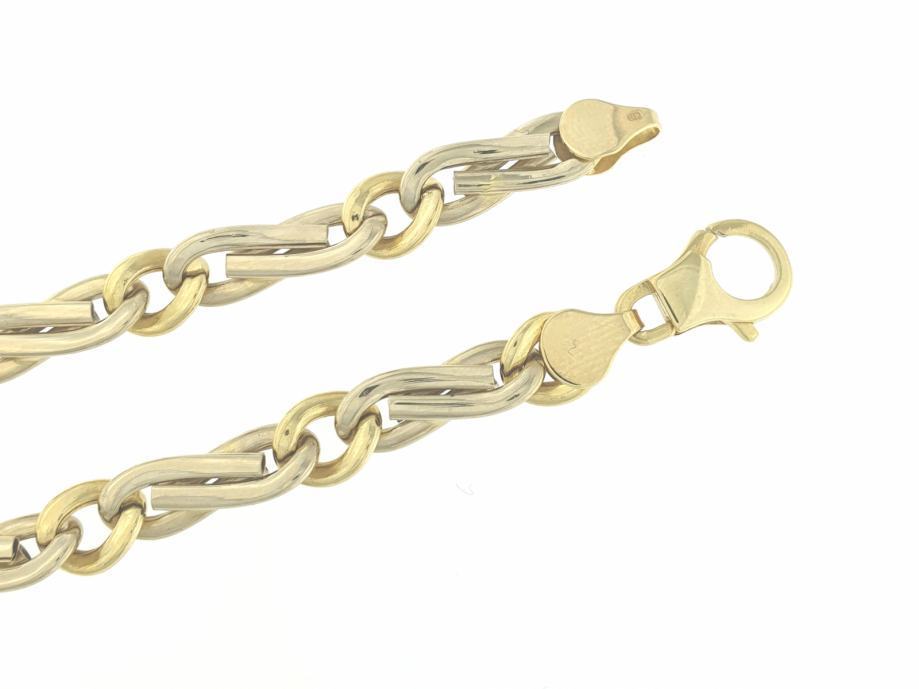 Zlatna narukvica, ženska, kombinacija žuto-bijelo zlato 14K, žig 585, duže i kraće šuplje karike.