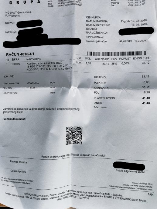 Kupljeno je 16.2.2026. u HG spotu na rasprodaji. Dolazi s 24 mjeseci jamstva.