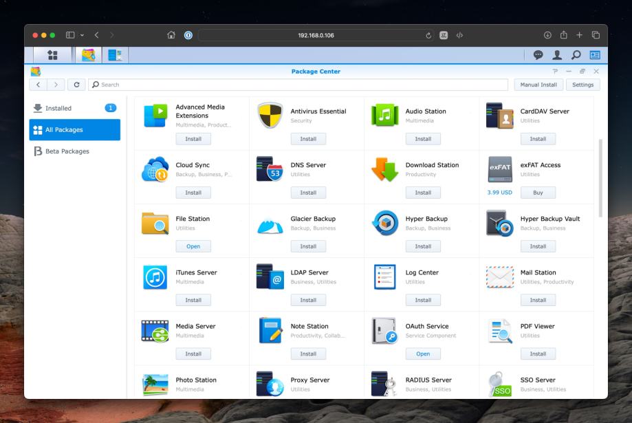 DiskStation Manager (DSM) operativni sustav, uključen i unaprijed instaliran, nudi bogat paket aplikacija za jednostavno upravljanje NAS uređajem. Kroz DSM možete konfigurirati sigurnosne kopije, dijeliti datoteke, postaviti multimedijalni server za streaming glazbe i videa, upravljati korisničkim pravima i sigurnošću, kao i pristupati svojim podacima daljinski putem mobilnih aplikacija ili web sučelja. Uz to, DSM omogućuje jednostavnu instalaciju dodatnih aplikacija iz Synology Package Center-a, kao što su antivirusni alati, VPN server, Cloud Sync za sinkronizaciju s popularnim cloud servisima, i mnoge druge opcije koje proširuju funkcionalnost uređaja.