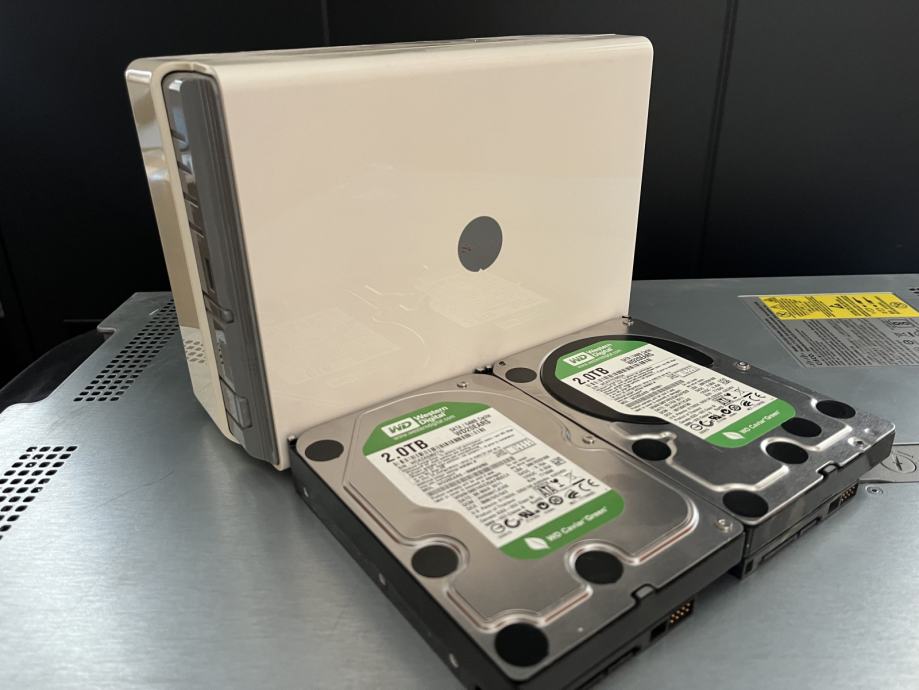 Uključen je originalni adapter za napajanje, mrežni kabel, i dva Western Digital Green diska kapaciteta 2TB svaki
