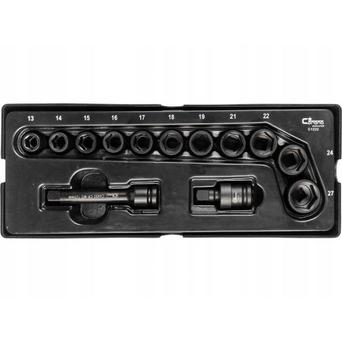 nasadni ključevi izrađene upravo od legure krom-molibden čelika (Cr-Mo) s povećanom otpornošću na udarceprihvat:1/2" šesterokutni nasadni ključeviveličina umetka: A 385 mm x 150 mmveličine 13;14;15;16;17;18;19;21;22;24;27 mm,nastavak 1/2" 125mm,kardanska veza]]>
