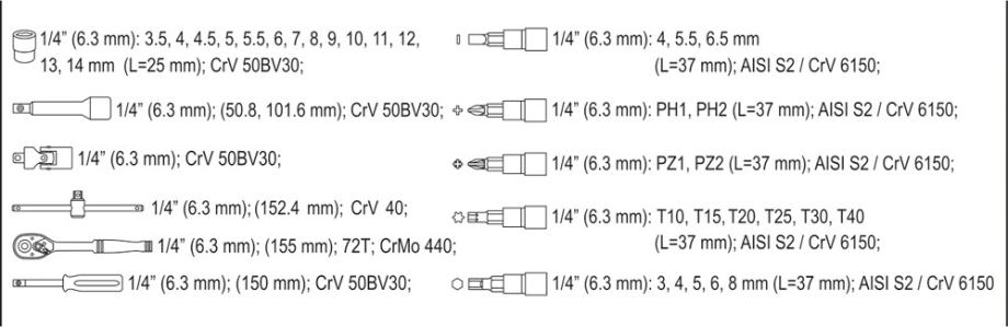 Nasadni ključevi su izrađeni od izdržljivog CrV 50BV30 krom-vanadij čelika; bitovi izrađeni od čvrstog S2 čelika