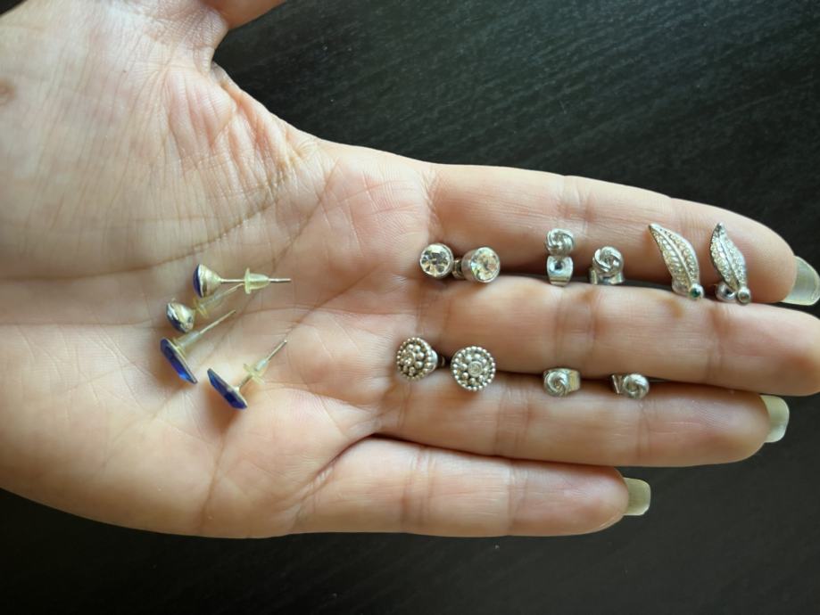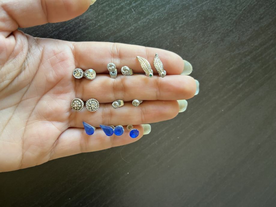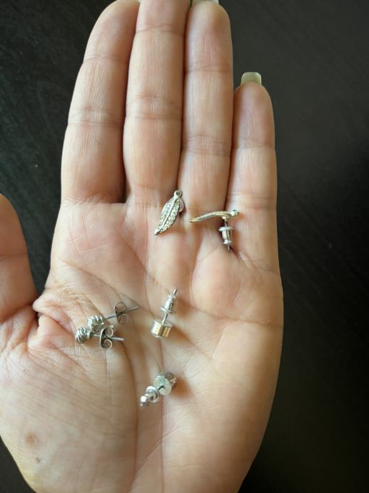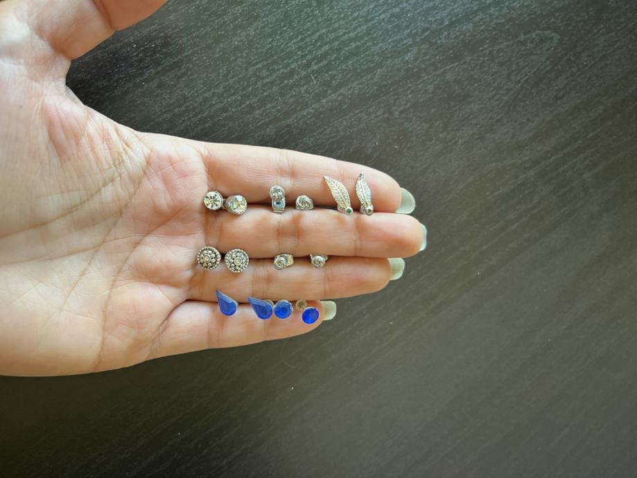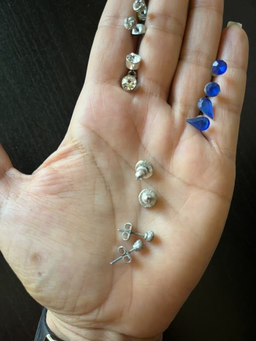 7 pari različitih naušnica, nošene jednom ili nijednom ali dugo stoje na hrpi pa neke imaju nedostatke. Plave su ružno ljepljene ali se ni vidi dok su na uhu, na jednom peru nedostaje cirkon, manji čvorići i cirkon puštaju boju. Cijena je za sve.