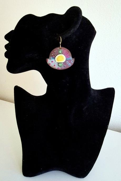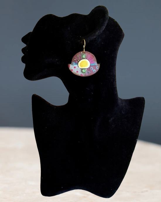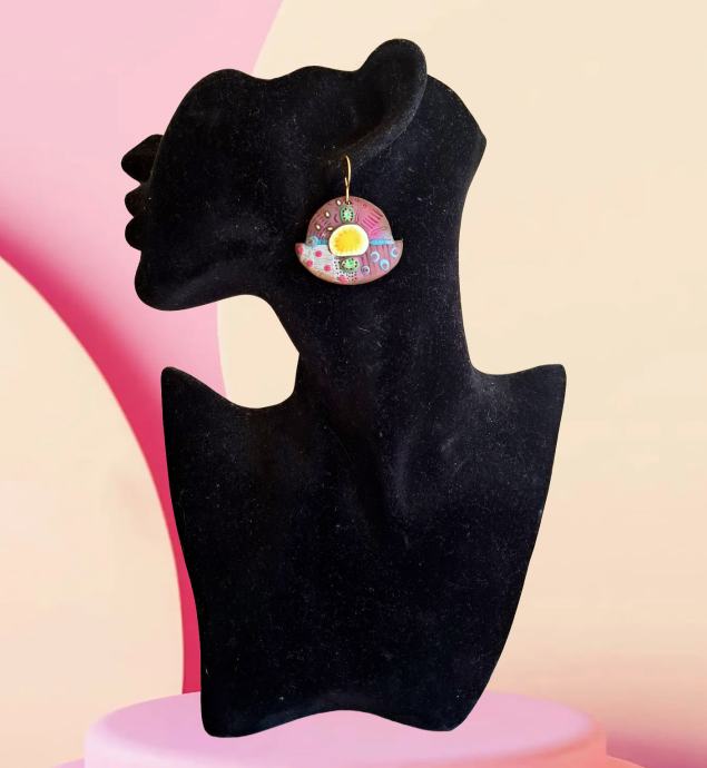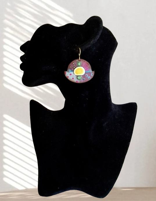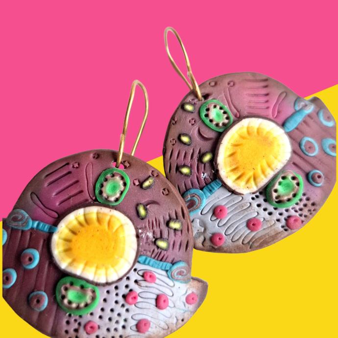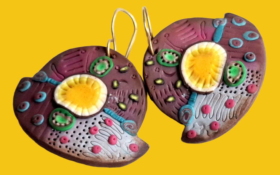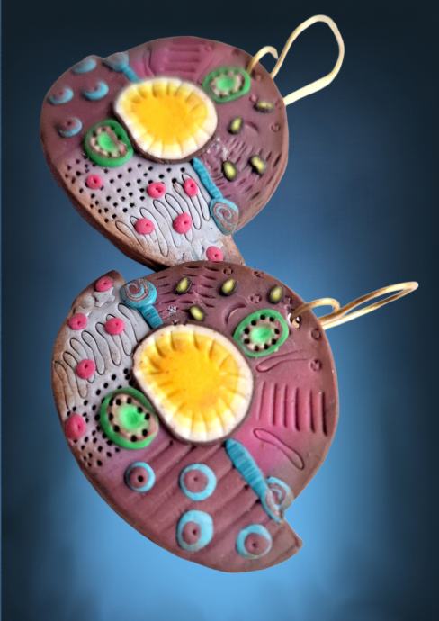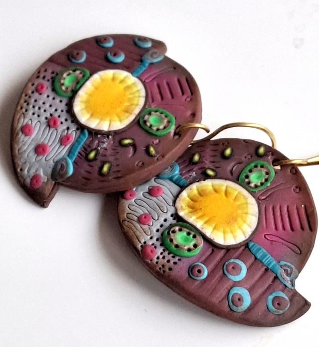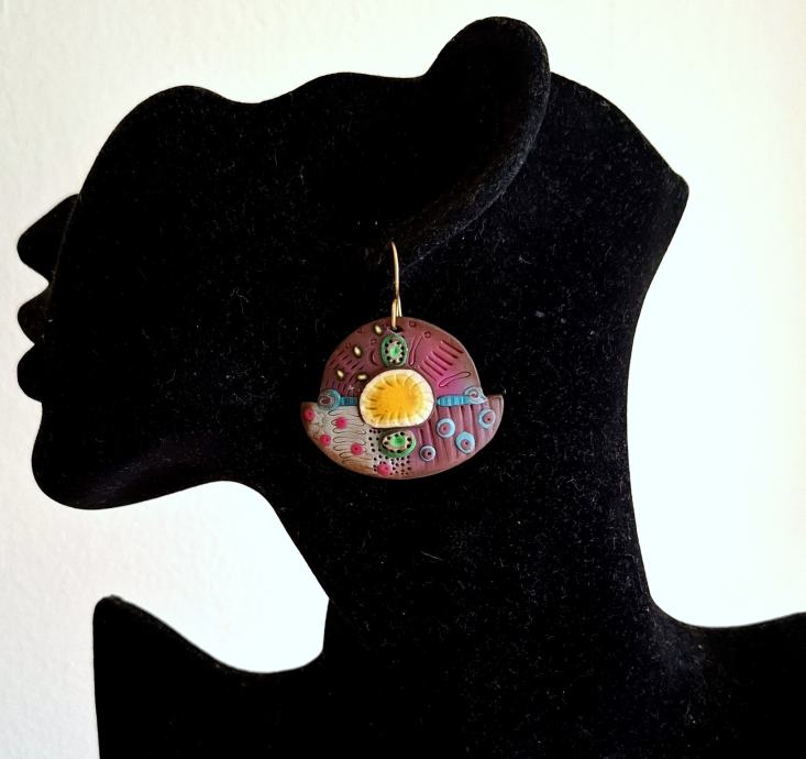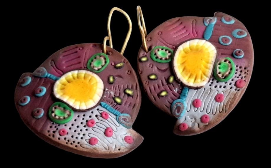 Art naušnice od polimerne gline, nijansirane, rezbarene, ukrašene ručno rađenim caneovima od polimerne gline unikatne, izrađene preciznom i složenom tehnikom. Vrlo ugodne za nošenje i lagane. Ručno oblikovana klipsa od mesing žice. Blago zaobljene. Duljina 3 cm, širina donjeg dijela 4,5 cm. Handmade.