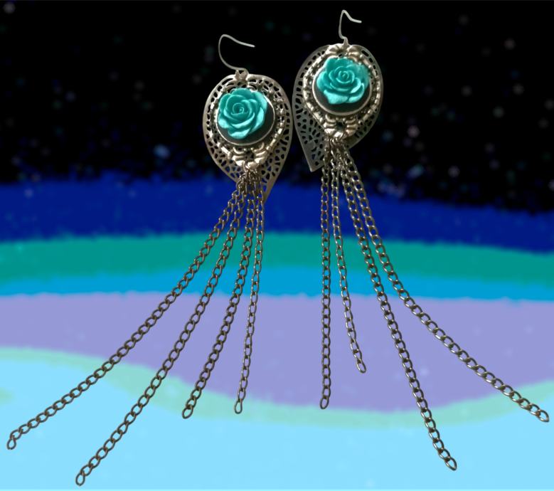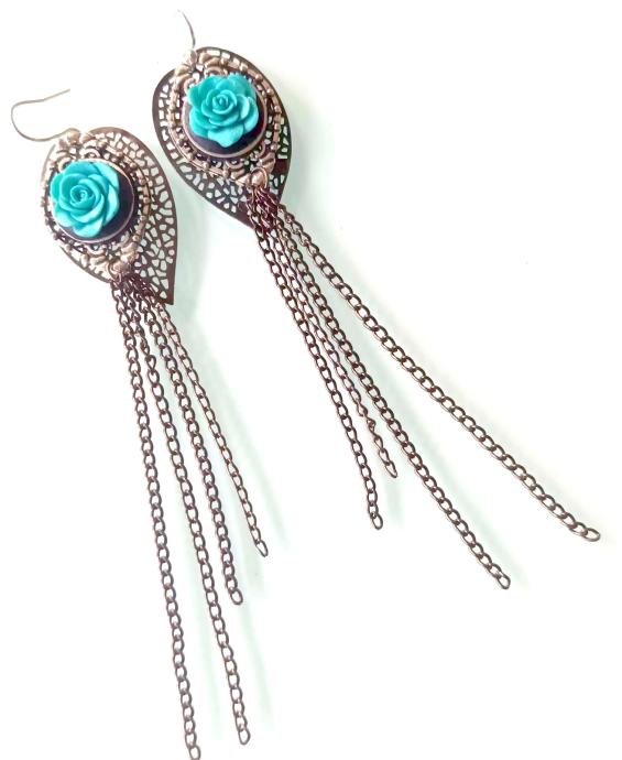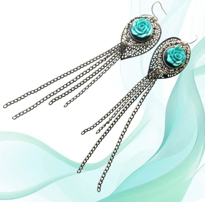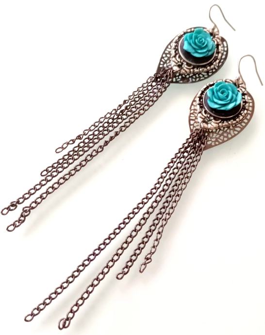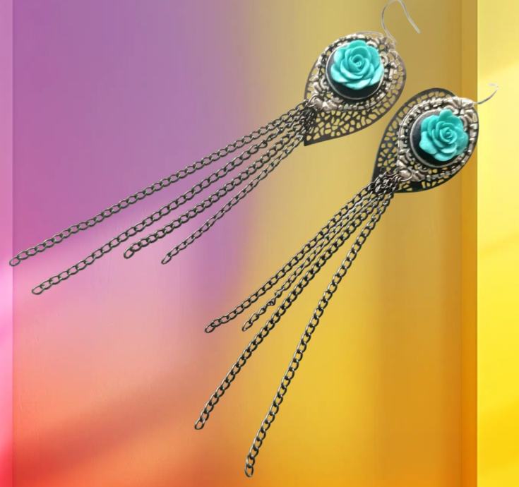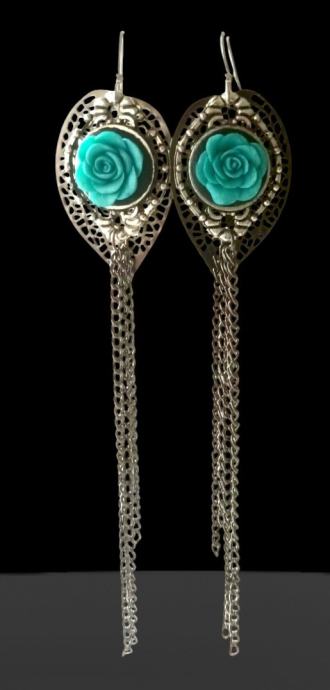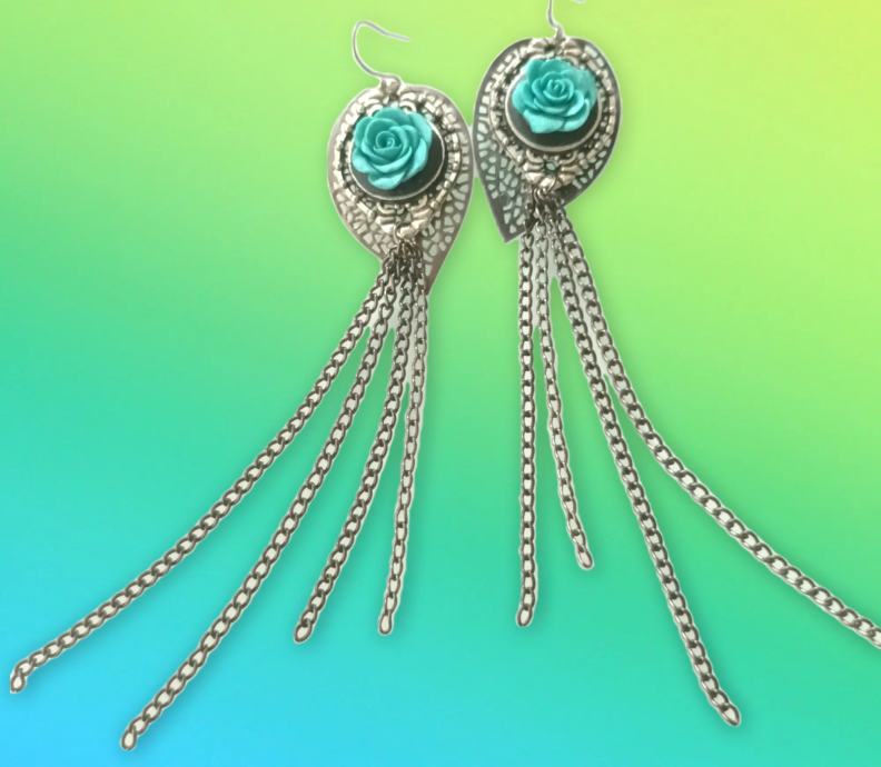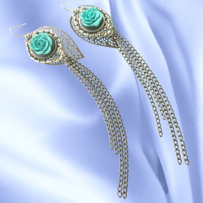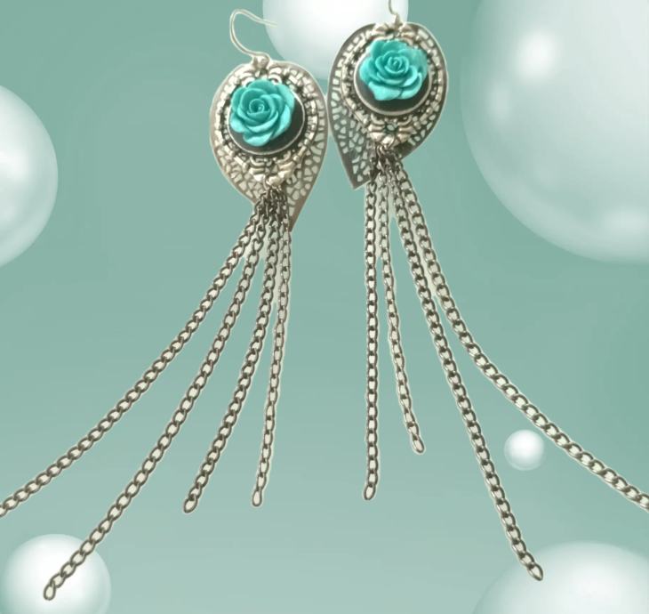 Predivne romantične naušnice s tiriznim minijaturnim cvjetićima u obliku ružica čija je svaka latica ručno modelirana od polimerne gline. Ukrašene duljim lančićima.