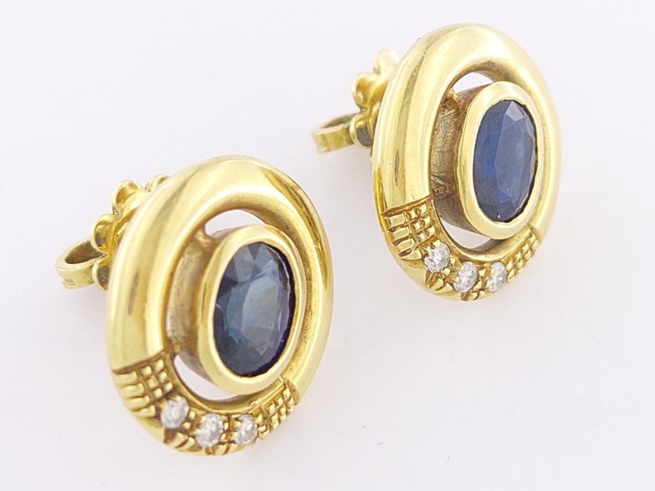 Zlatne štift naušnice, ovalni oblik, u sredini ovalni tamnoplavi safir, ispod njega dijamantići 0,02ct, žuto 18K zlato, žig 750.