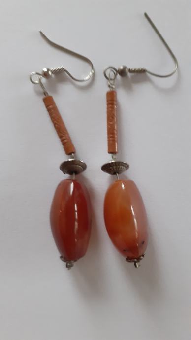 Naušnice cca. 6 cm s perlicom od poludragog kamena (možda karneol) i srebrnim detaljima. Nošene.