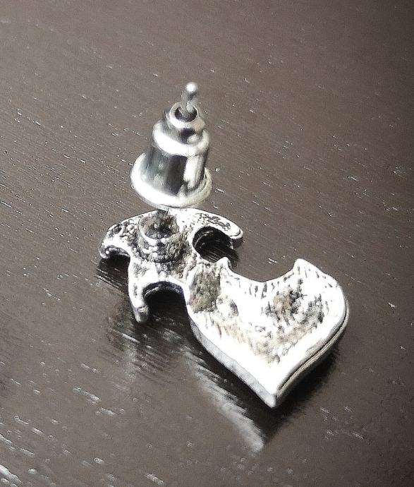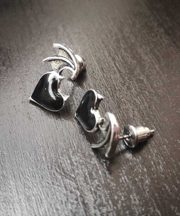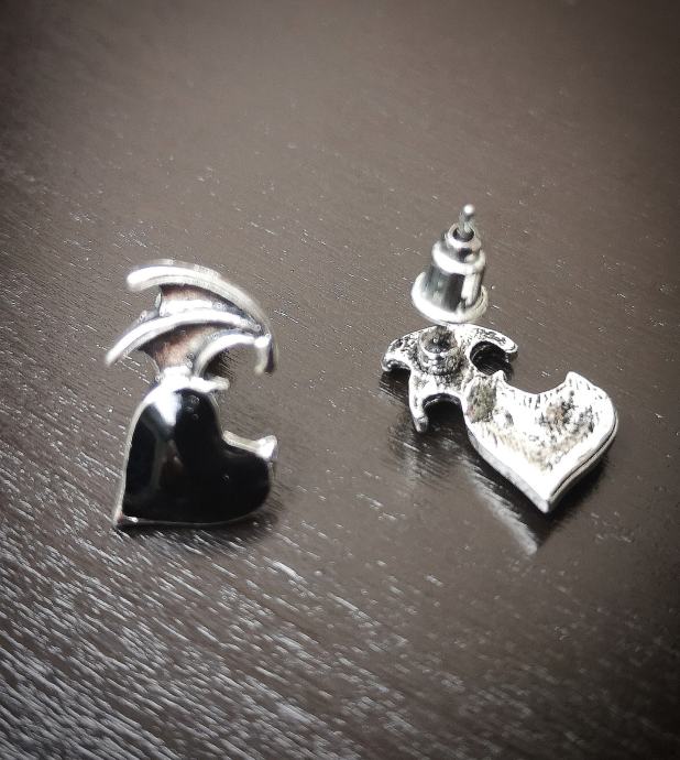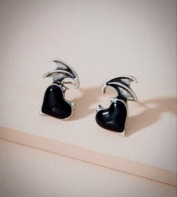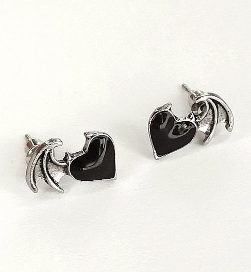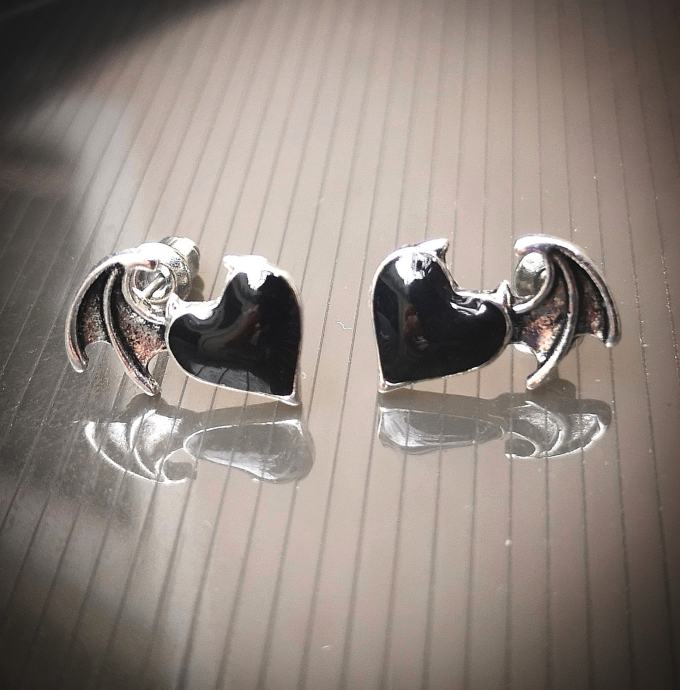 Male ali upečatljive naušnice s centralnim motivom crnog srca s krilima i sitnim rožićima.