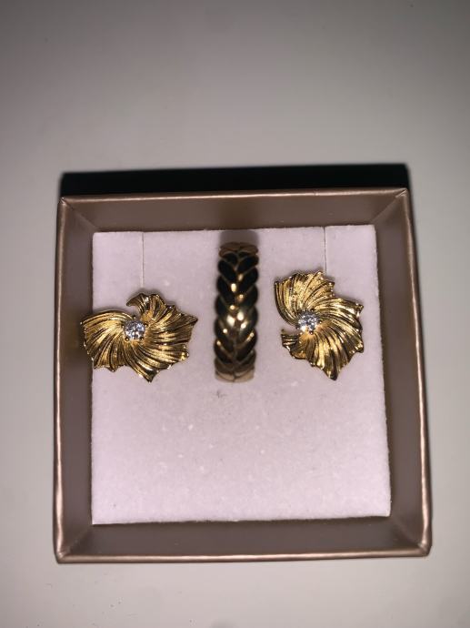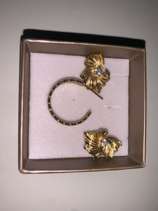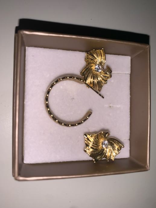 Prodajem elegantne naušnice zlatne boje s dekorativnim detaljima. Naušnice su oblikovane poput lepeze ili cvijeta s rebrastim teksturama i ukrašene su sitnim kamenom u sredini. Dizajn je sofisticiran i atraktivan, a kvaliteta izrade vidljiva je u detaljima.