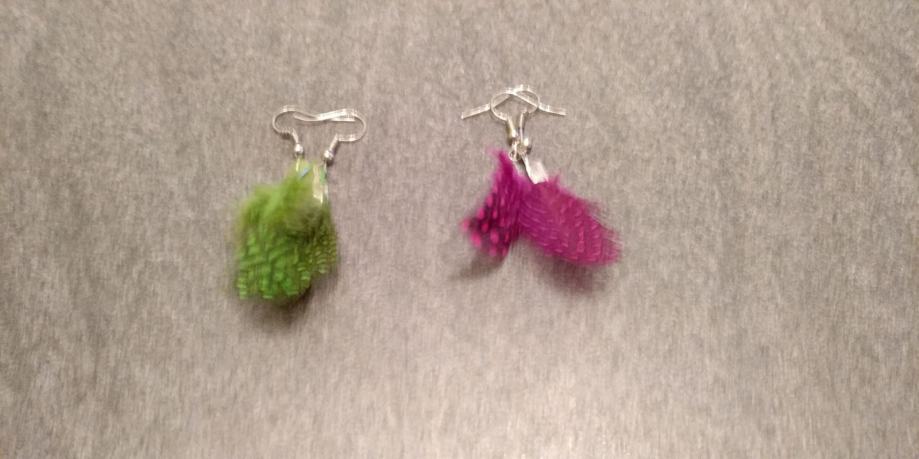 Izradjene od prepeličjeg perja u zelenoj i roza boji. Kupac dobija 2 para naušnica sa slike. Ili može boja po izboru kupca.