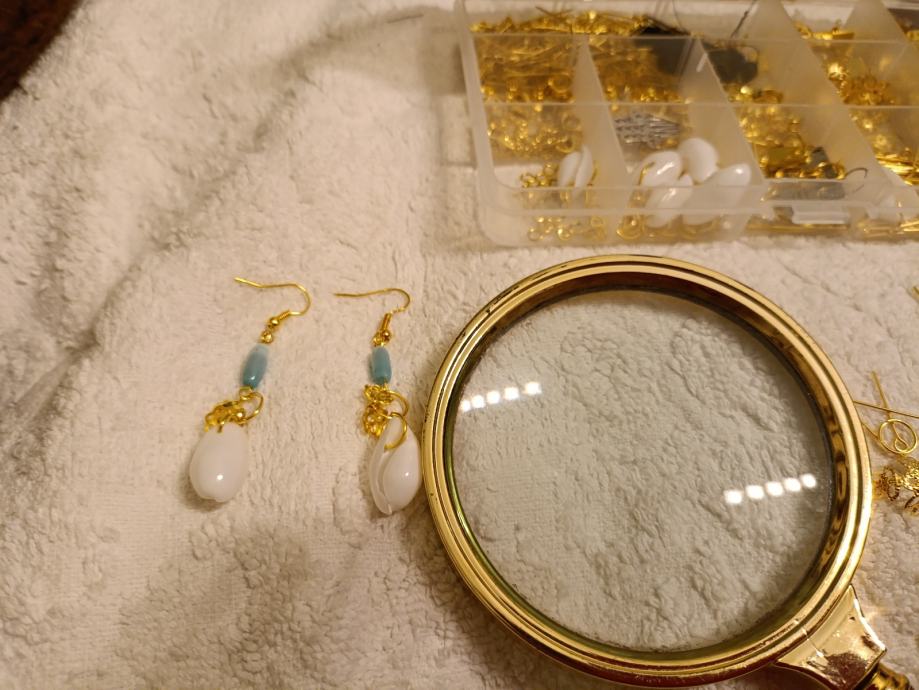 Školjka kauri i svjetloplave perle.