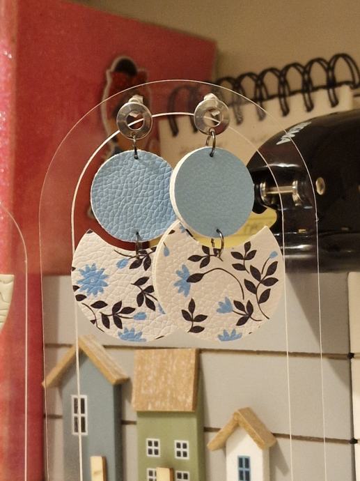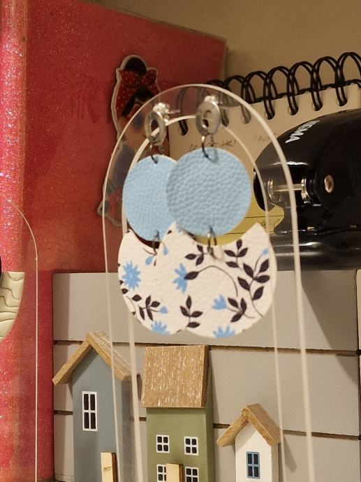 Prodajem potpuno nove plave naušnice s cvjetnim uzorkom, nikad nošene. Izrađene su od kombinacije materijala s plavim kružnim elementima i ukrasnim cvjetnim dijelom. Lagane su i idealne za svakodnevno nošenje ili posebne prilike. Vrlo lagane. Duljina 6 cm.