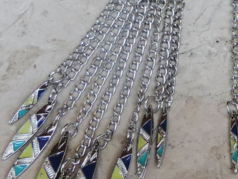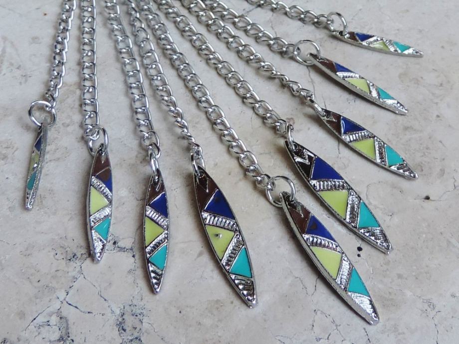 S ornamentiranog trokutastog gornjeg dijela visi 7 tankih lančića različite duljine, na čijim se završecima nalaze duguljasti privjesci ukrašeni plavim, žutim i tirkiznim trokutićima.