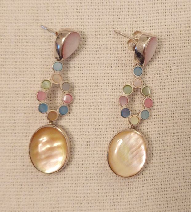 Potpuno nove srebrne naušnice s poludragim kamenom sedefom u pastelnim nijansama. Srebro 925, sa žigom na poleđini.